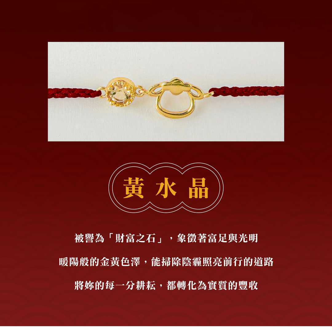 以細緻紅繩編織,結合黃水晶和十二生肖專屬寓意,將每一分耕耘化為實質收穫。精緻輕奢設計,長度可調,是新年送禮與犒賞自我的最佳選擇。
