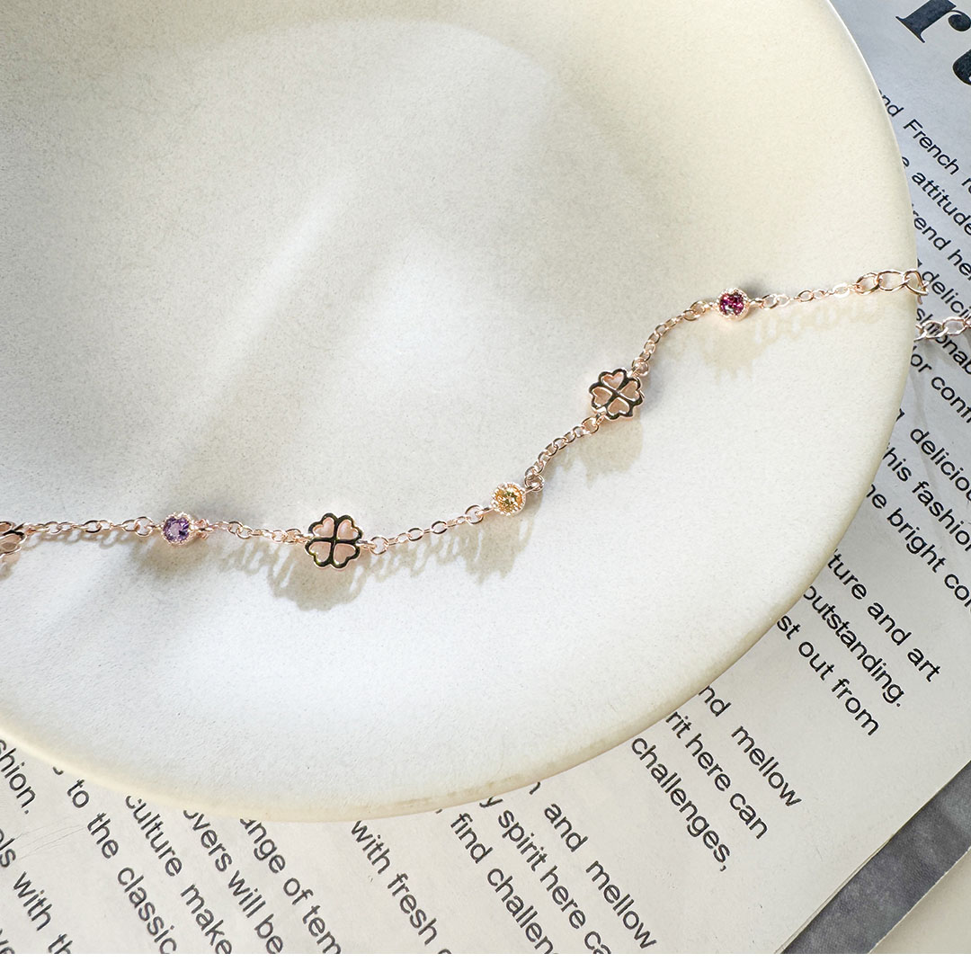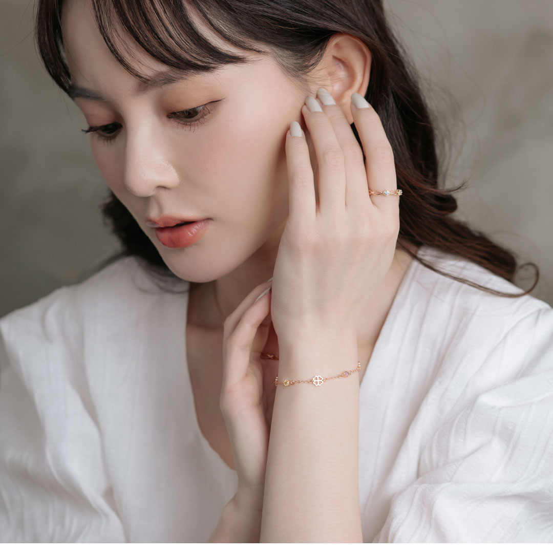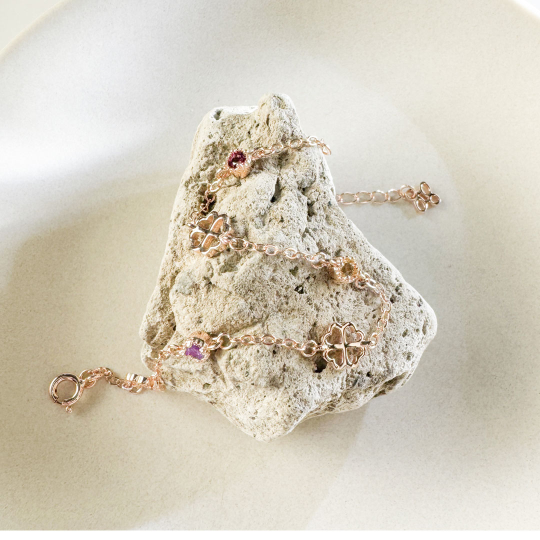 這款精緻的手鍊以四葉幸運草搭配天然水晶為特色,不僅展現出自然之美,也是幸運和希望的美好寄語。