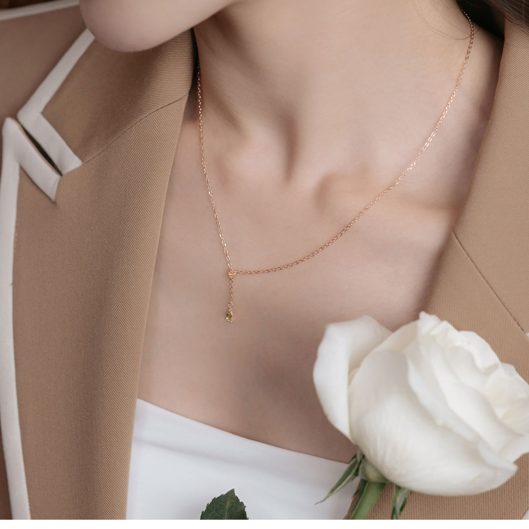 這款Y字項鍊簡約而精緻,既顯細膩又散發出柔和的光澤,優雅地點綴著佩戴者的頸間。
