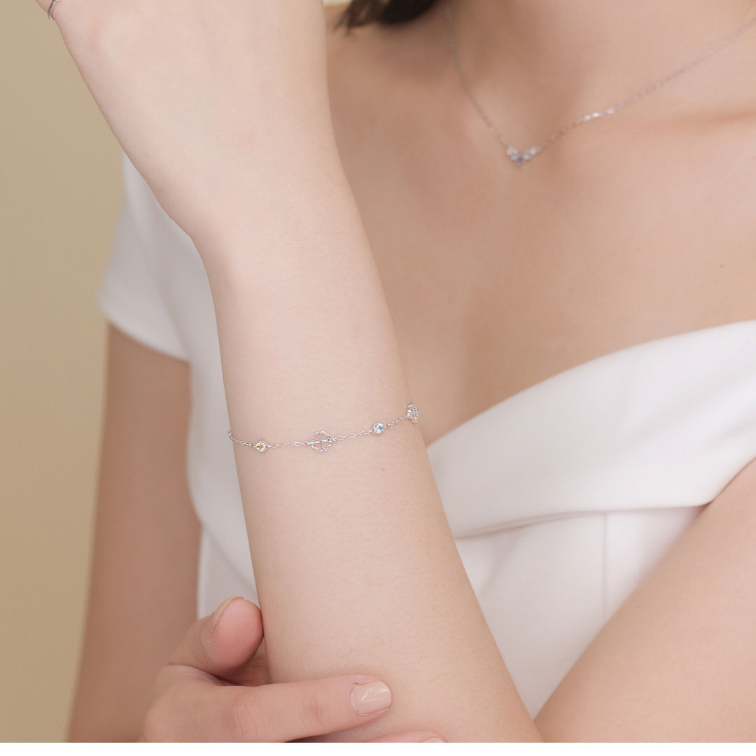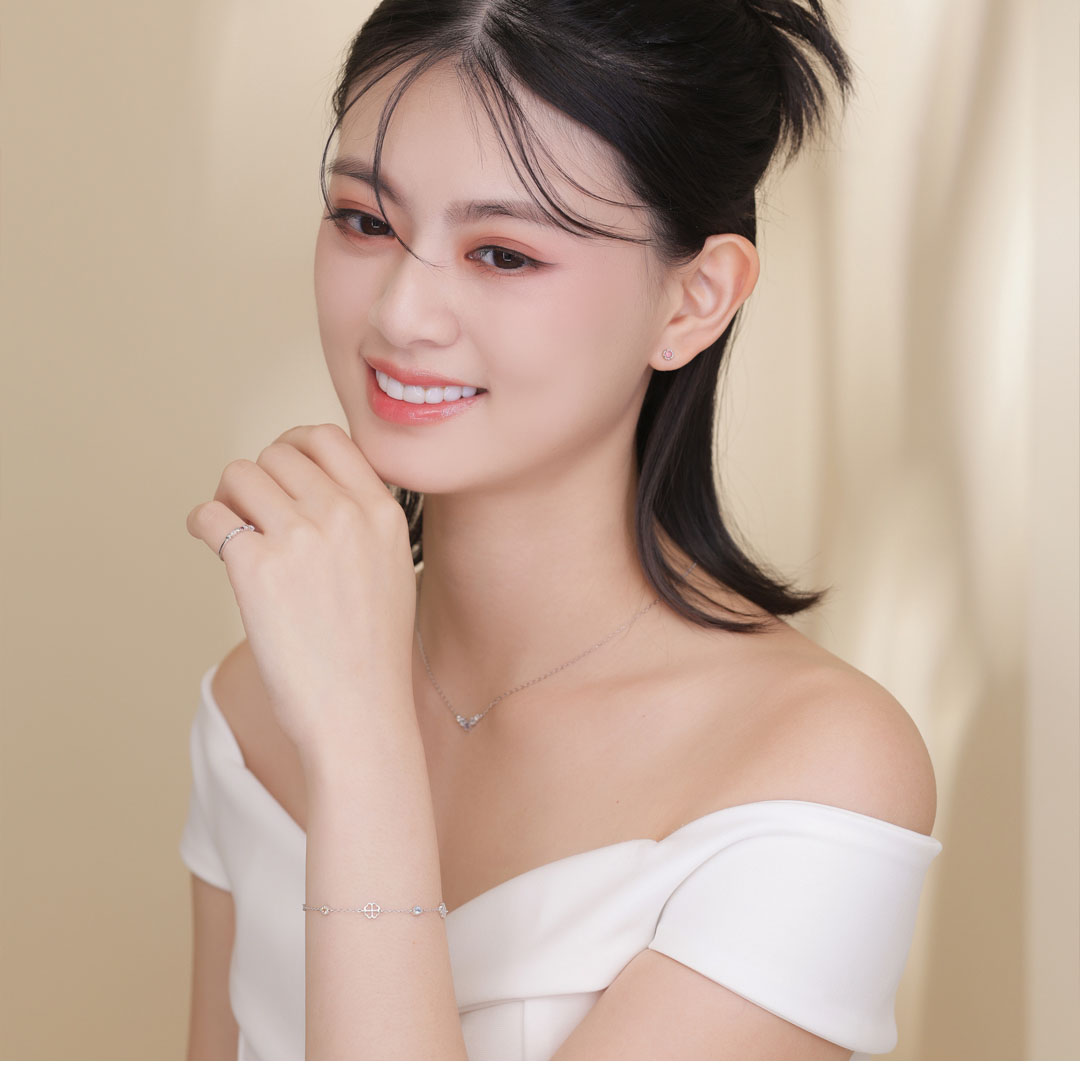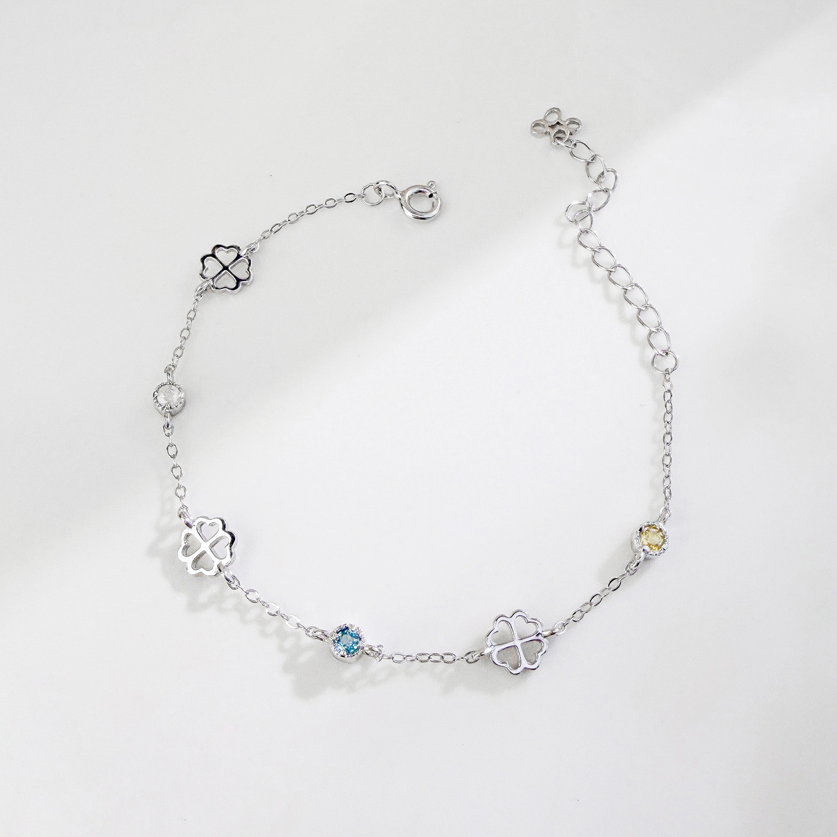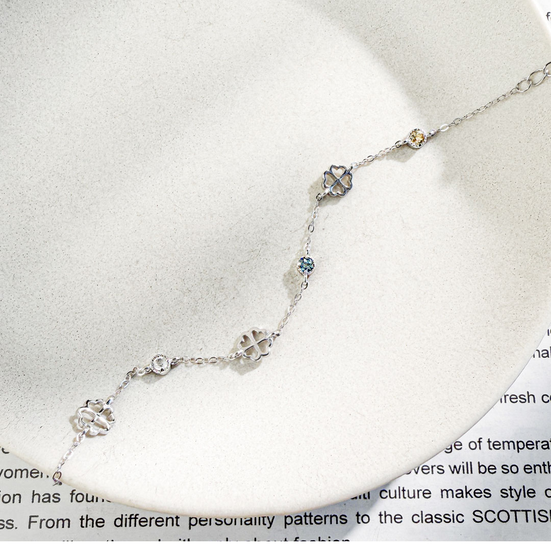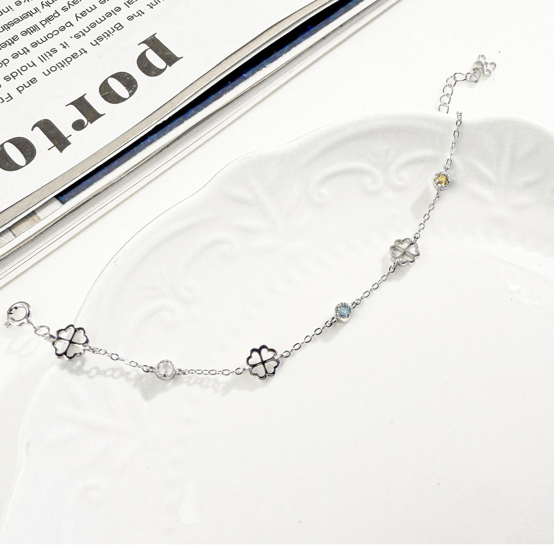 這款精緻的手鍊以四葉幸運草搭配天然水晶為特色,不僅展現出自然之美,也是幸運和希望的美好寄語。