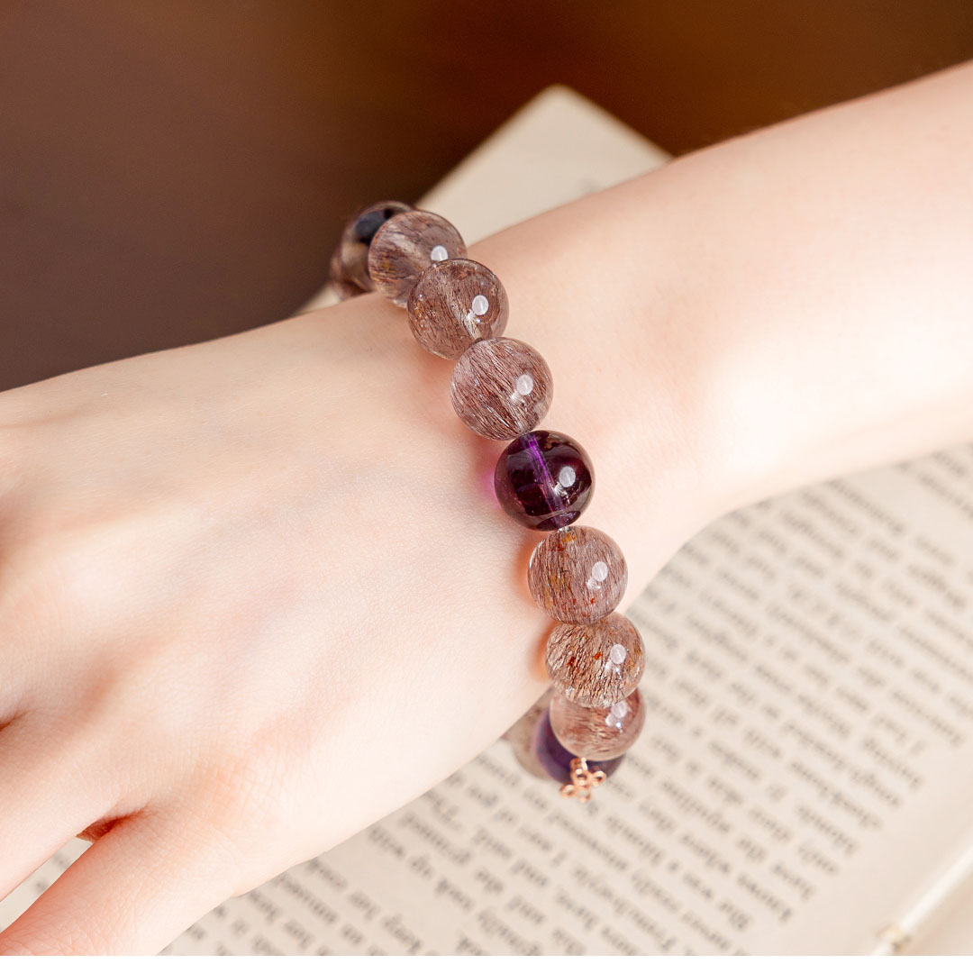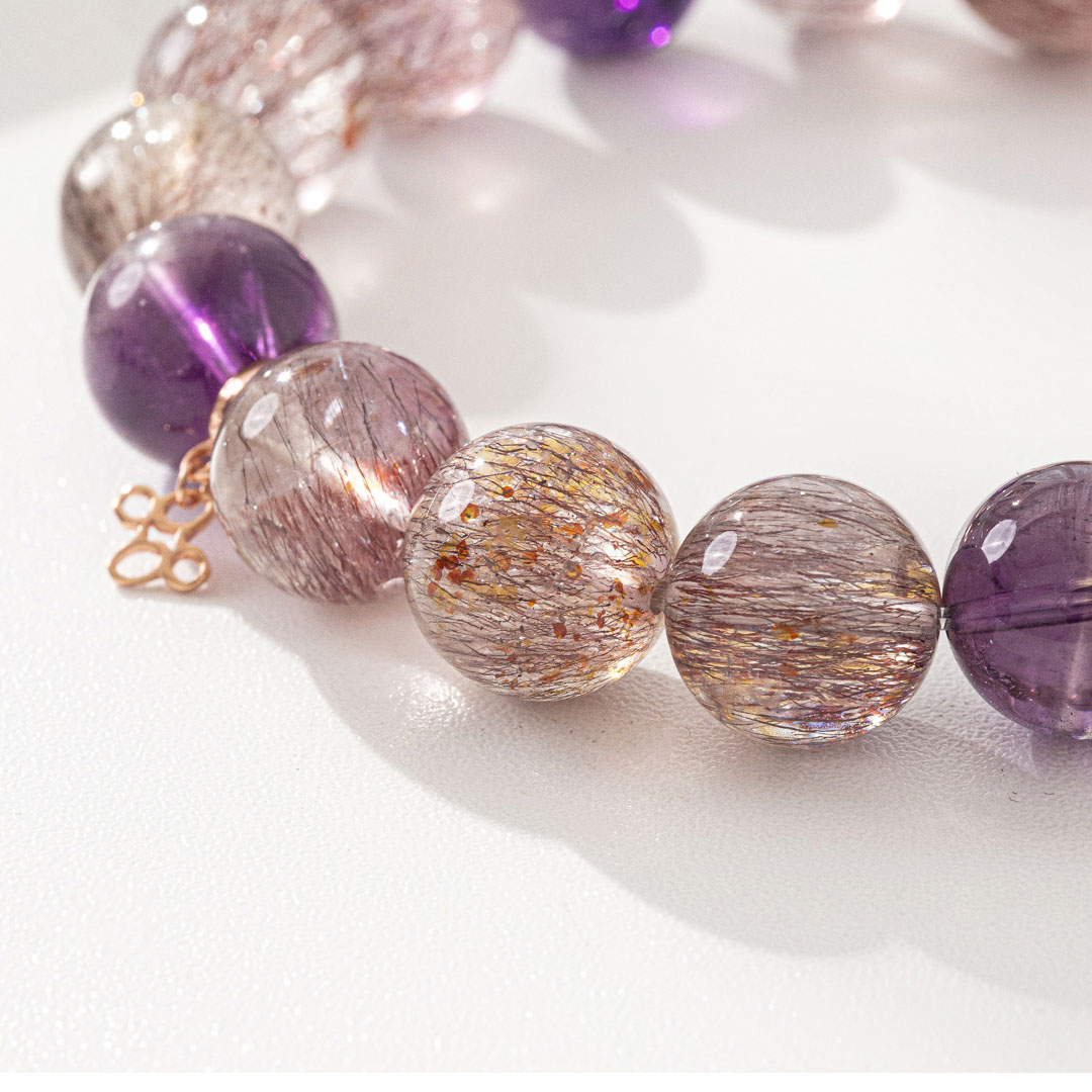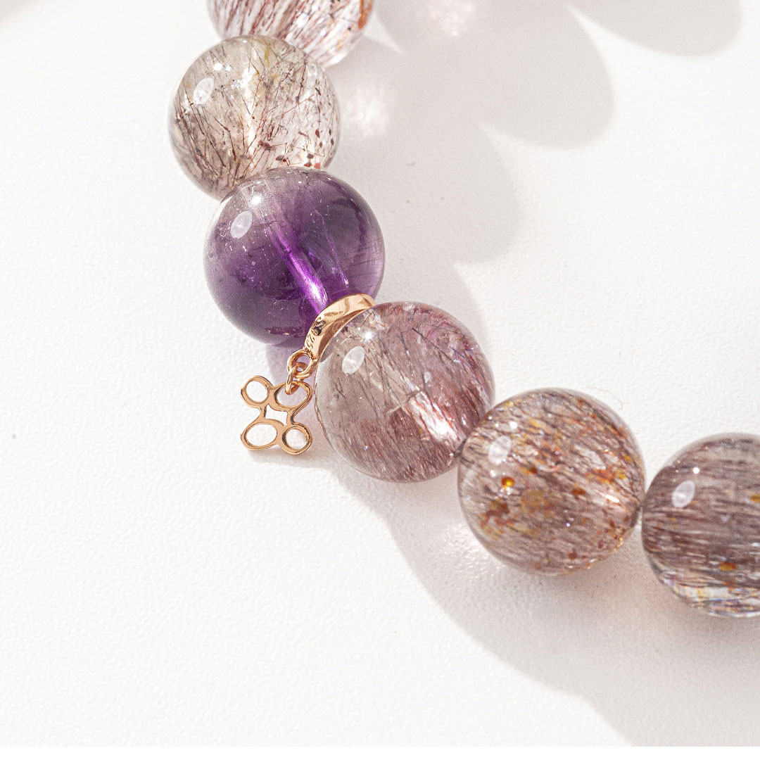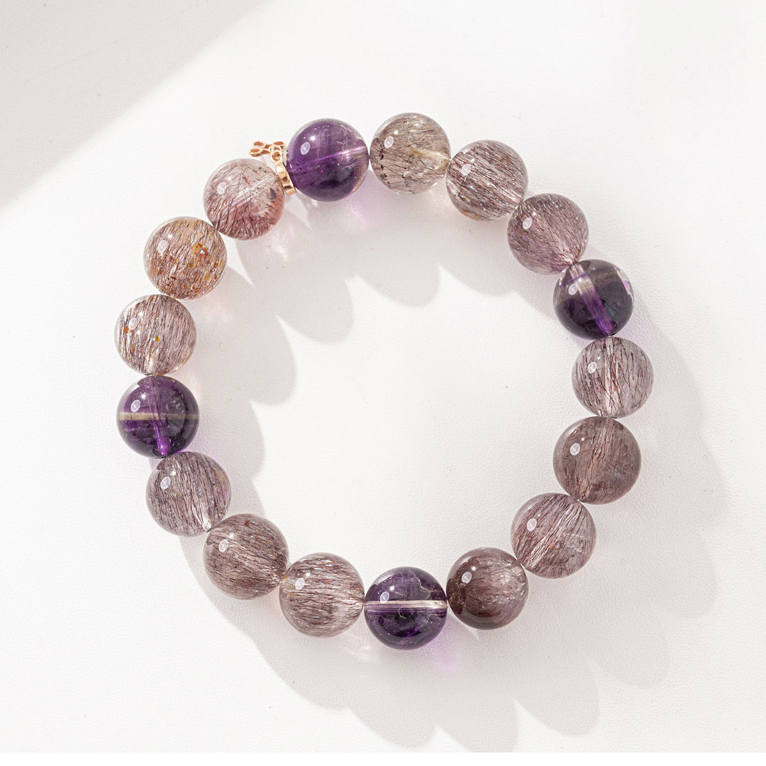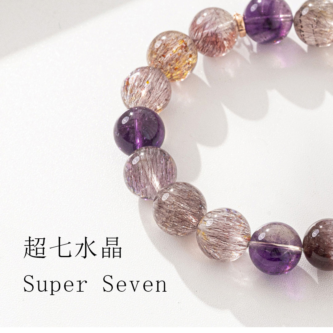 超七水晶的外觀充滿魅力,內含紫水晶、茶晶、鈦晶、黃磷鐵礦、針鐵礦、纖維礦、金紅石七種礦,透過半透明的晶體,可以看到其中蘊含的多種礦物,呈現出多彩的斑紋和閃耀的光芒。當光線穿透水晶時,七種礦物交相輝映,宛如一幅絢麗的畫卷,給人以視覺和心靈的雙重享受。