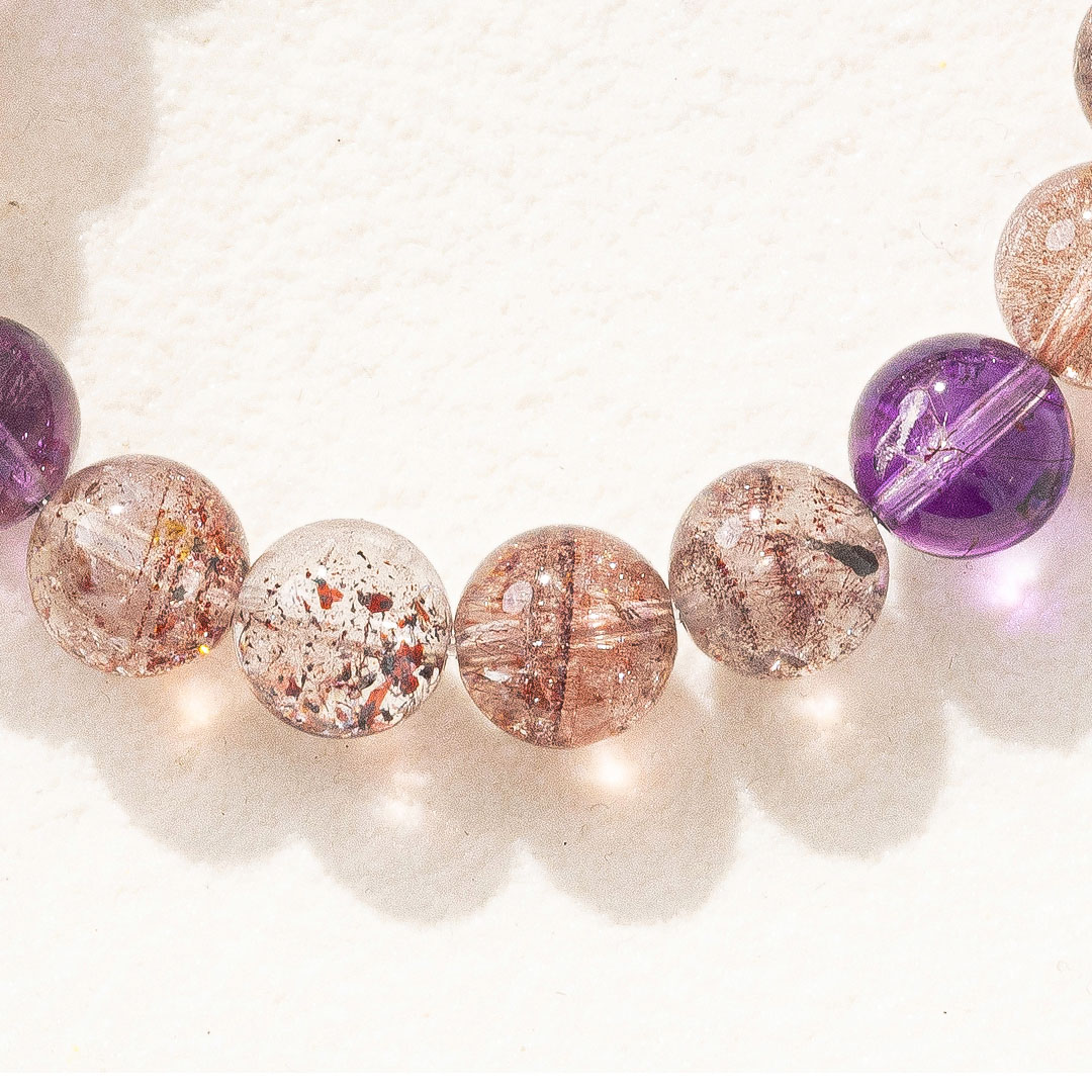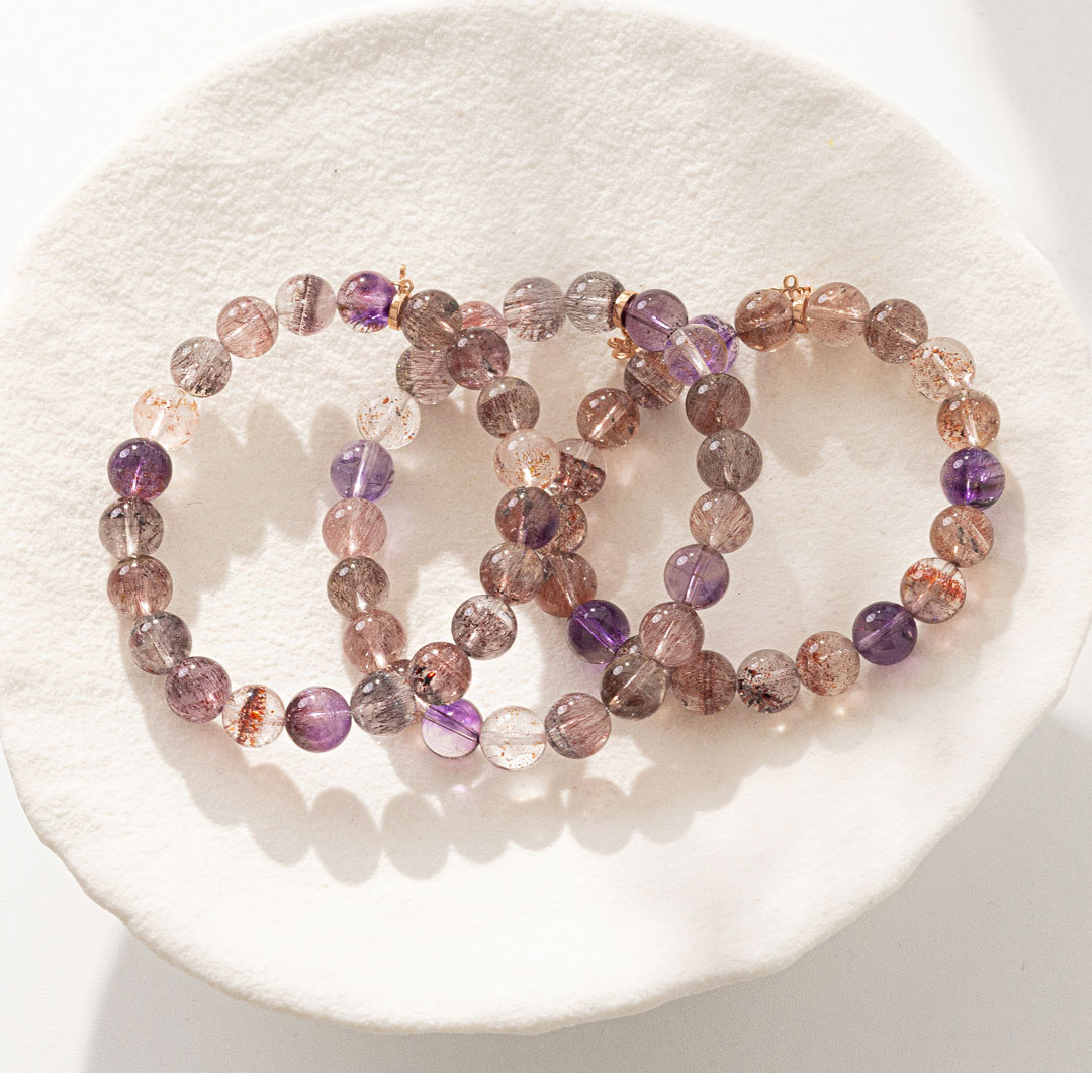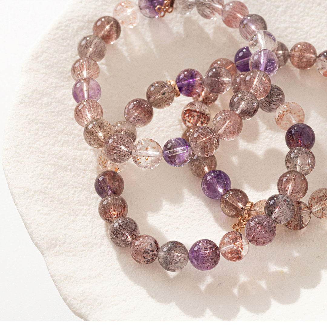 超七水晶的外觀充滿魅力,內含紫水晶、茶晶、鈦晶、黃磷鐵礦、針鐵礦、纖維礦、金紅石七種礦,透過半透明的晶體,可以看到其中蘊含的多種礦物,呈現出多彩的斑紋和閃耀的光芒。當光線穿透水晶時,七種礦物交相輝映,宛如一幅絢麗的畫卷,給人以視覺和心靈的雙重享受。