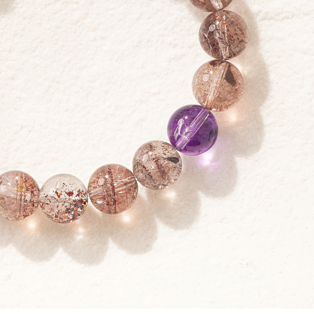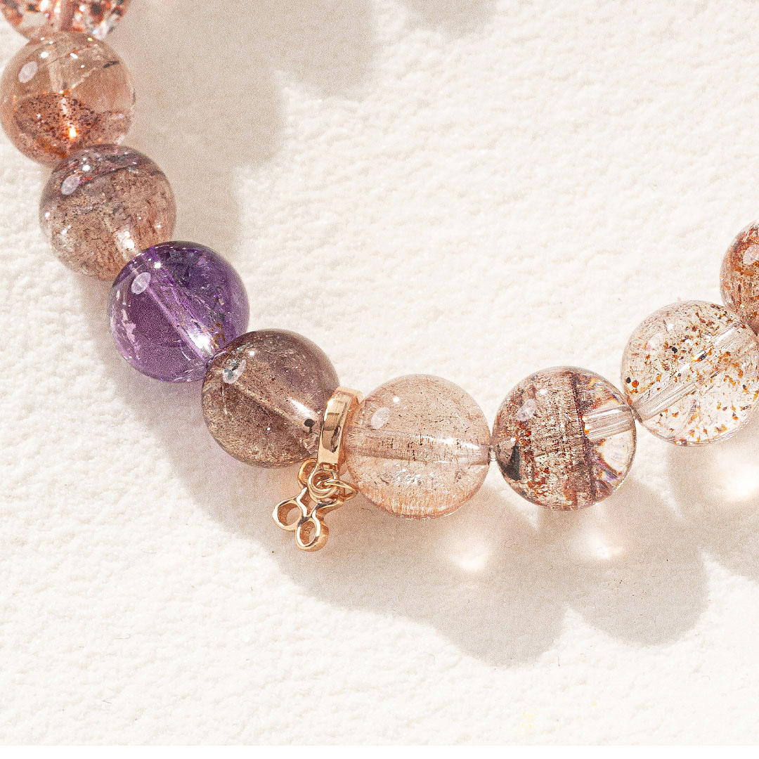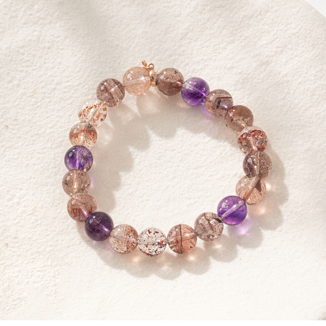 超七水晶的外觀充滿魅力,內含紫水晶、茶晶、鈦晶、黃磷鐵礦、針鐵礦、纖維礦、金紅石七種礦,透過半透明的晶體,可以看到其中蘊含的多種礦物,呈現出多彩的斑紋和閃耀的光芒。當光線穿透水晶時,七種礦物交相輝映,宛如一幅絢麗的畫卷,給人以視覺和心靈的雙重享受。