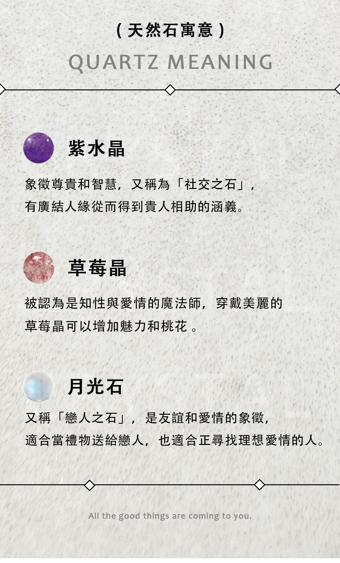 ▴ 天然礦石是在地殼中自然形成的晶體礦物,每一顆的色澤深淺、結晶、髮根都不大相同,且晶體會有冰裂棉絮、坑窪、黑點、礦缺等「天然特質」,並非瑕疵。