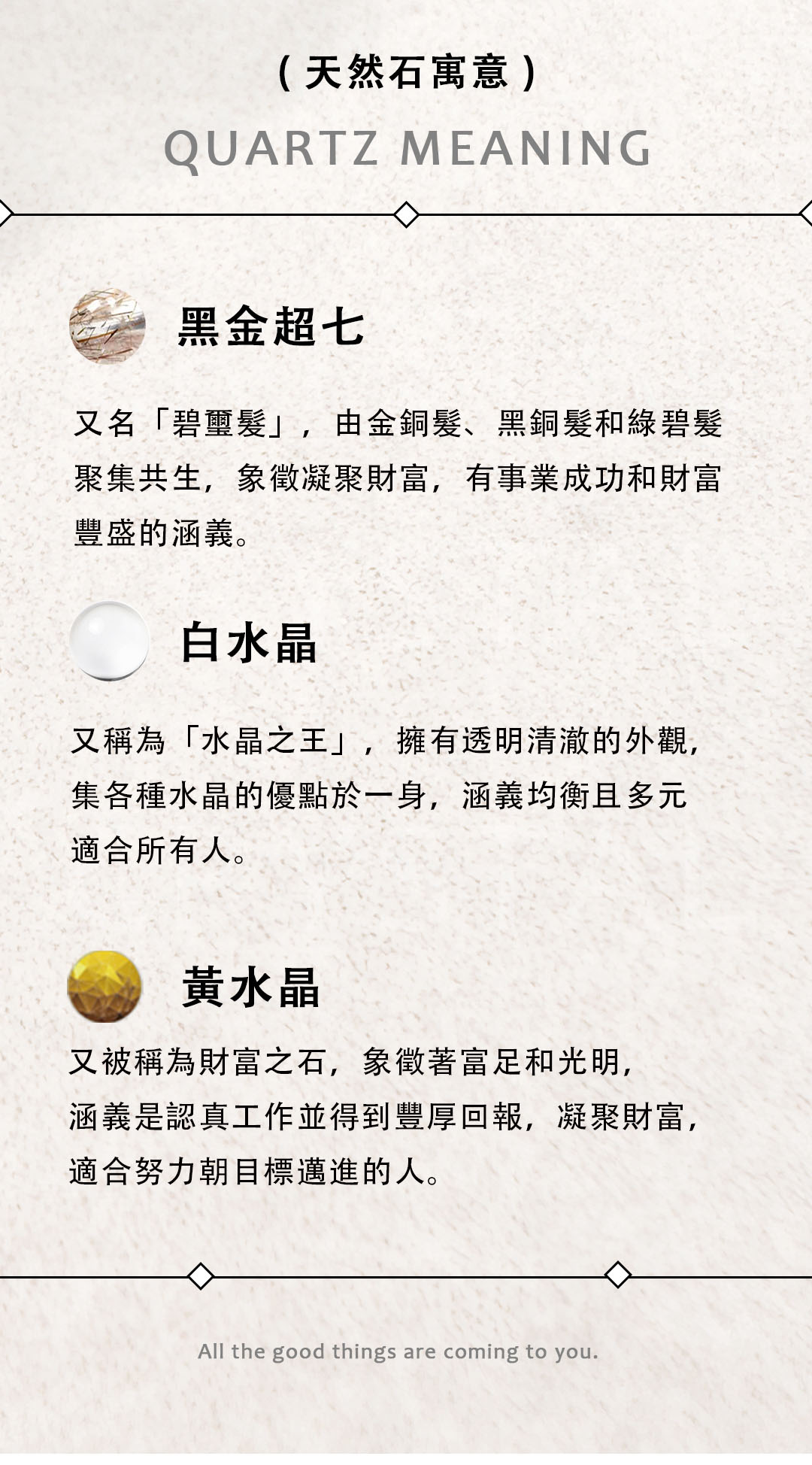 ▴ 天然礦石是在地殼中自然形成的晶體礦物,每一顆的色澤深淺、結晶、髮根都不大相同,且晶體會有冰裂棉絮、坑窪、黑點、礦缺等「天然特質」,並非瑕疵。