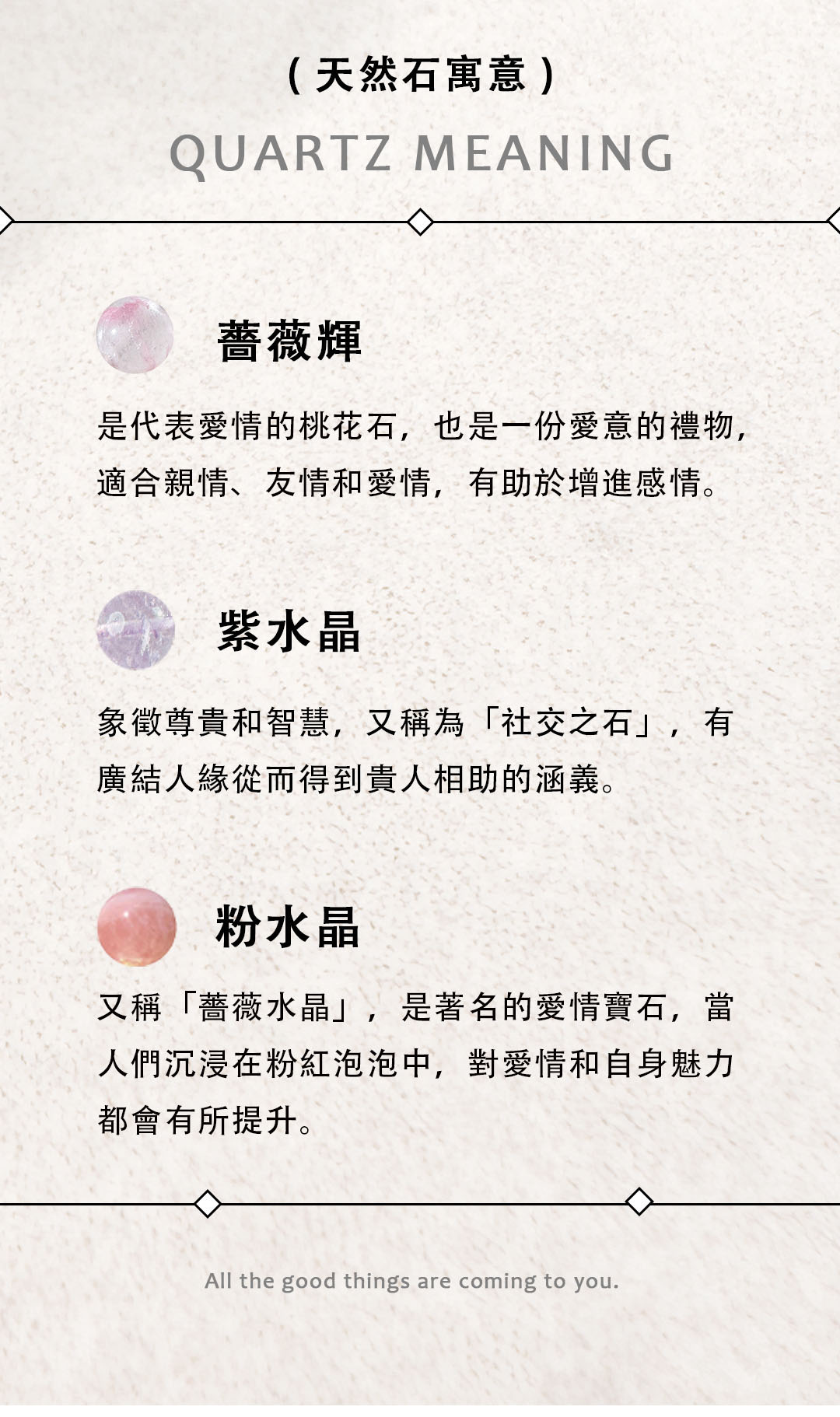 粉水晶 ( Rose Quartz ) 又稱「薔薇水晶」,是著名的愛情寶石, 當人們沉浸在粉紅泡泡中,對愛情和自身魅力都會有所提升。