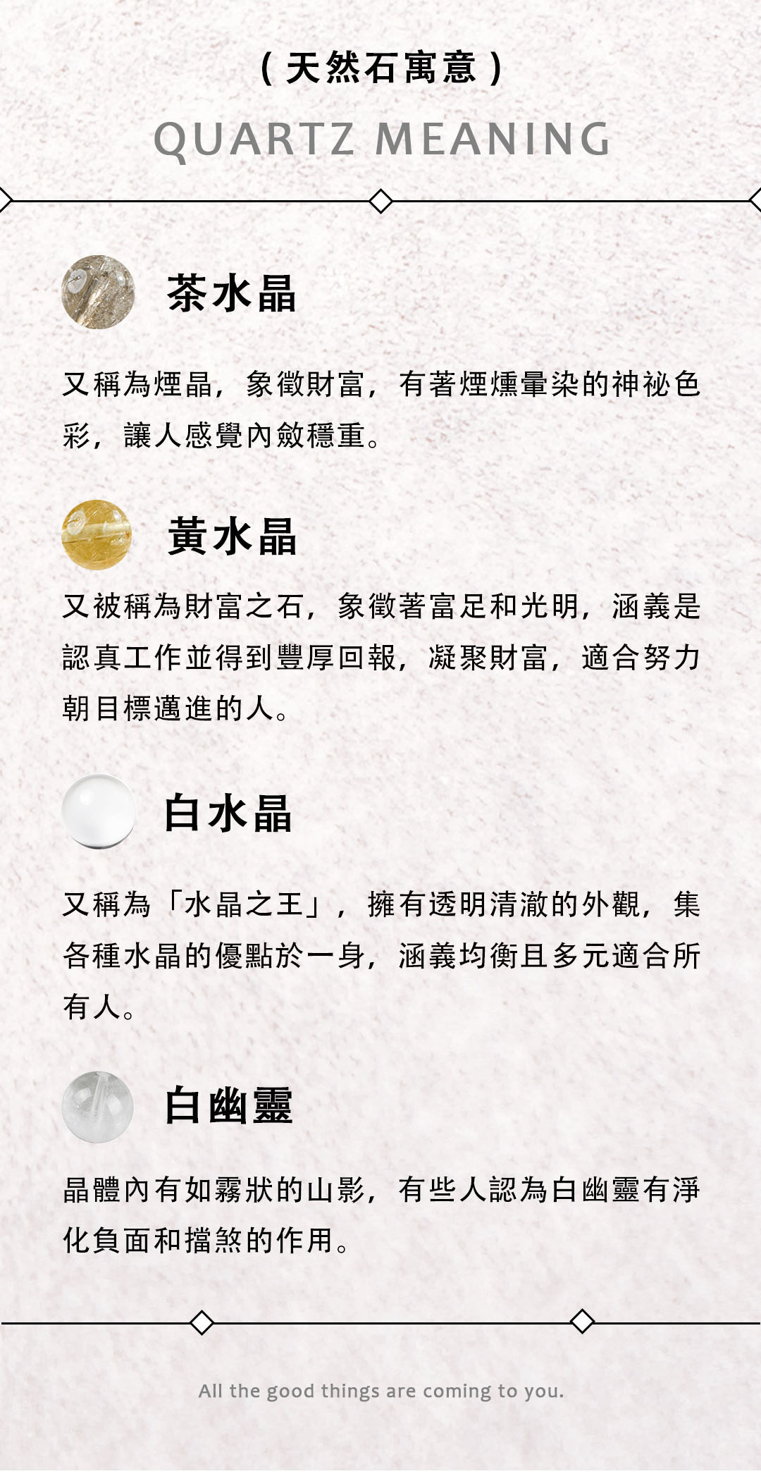 茶水晶 ( Smoky Quartz ) 又稱為煙晶,象徵財富,有著煙燻暈染的神祕色彩,讓人感覺內斂穩重。