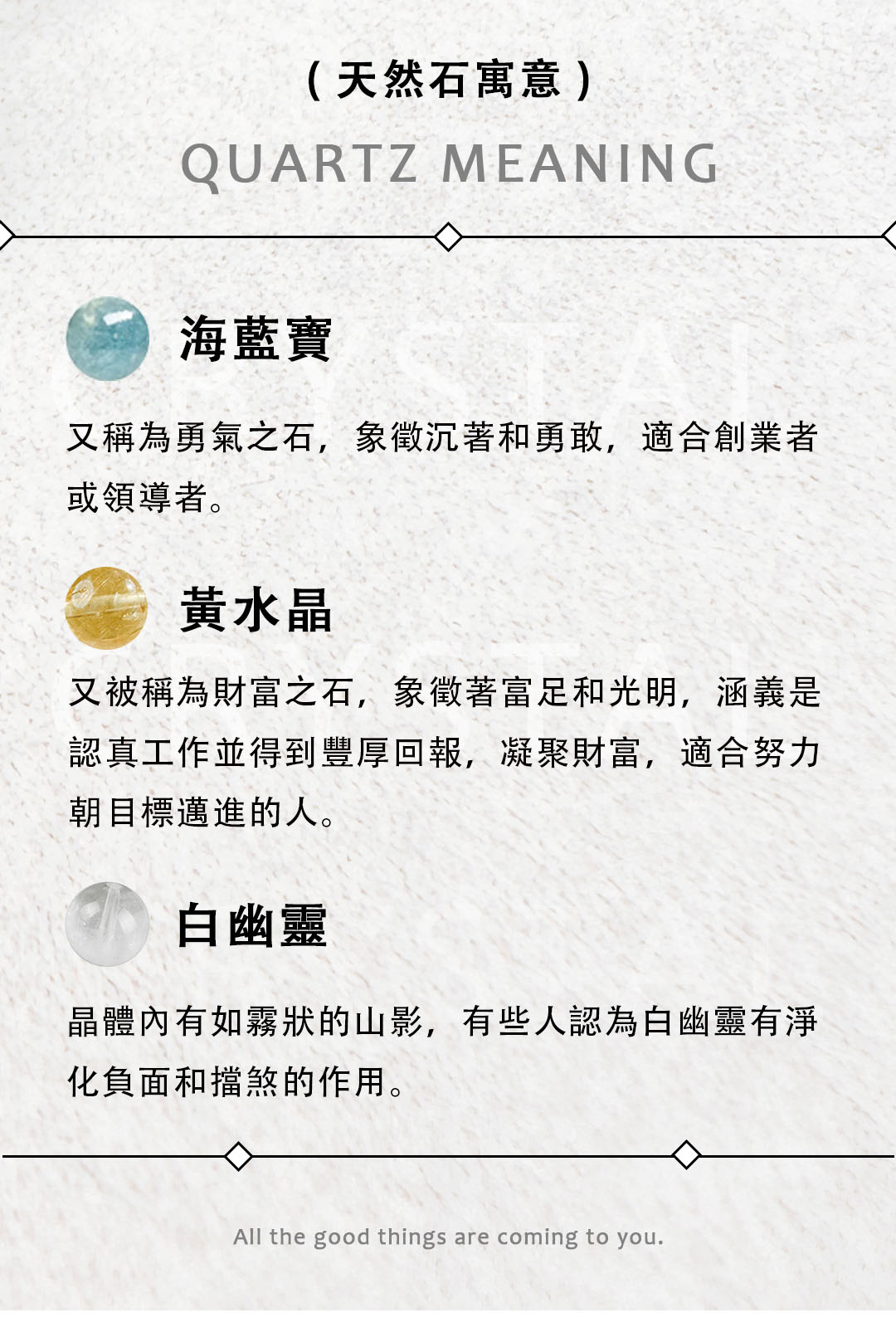 黃水晶 ( Citrine ) 又被稱為財富之石,象徵著富足和光明,涵義是認真工作並得到豐厚回報,凝聚財富,適合努力朝目標邁進的人。
