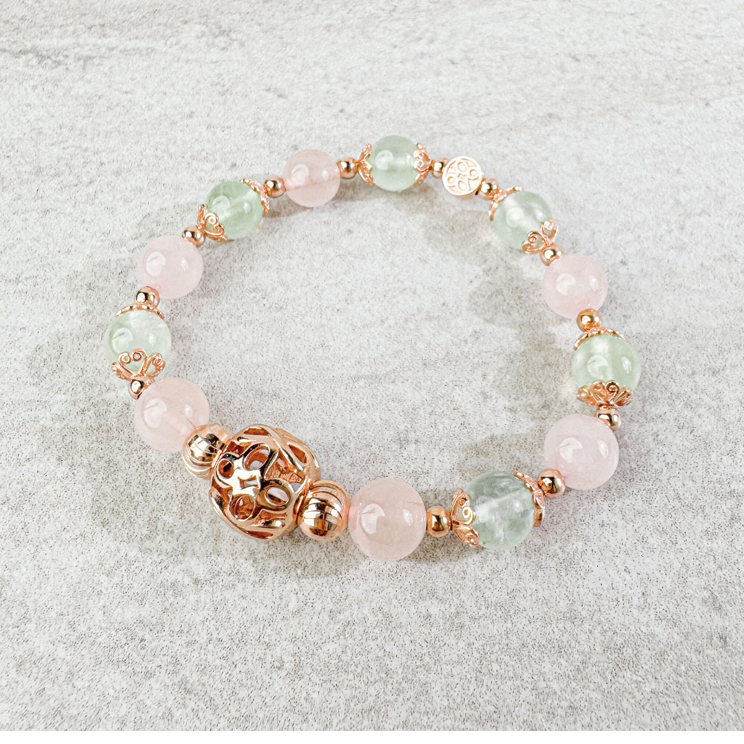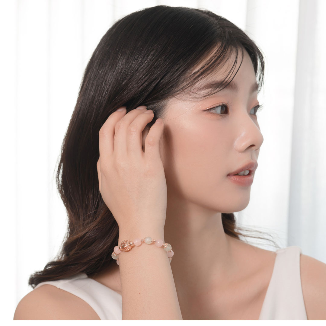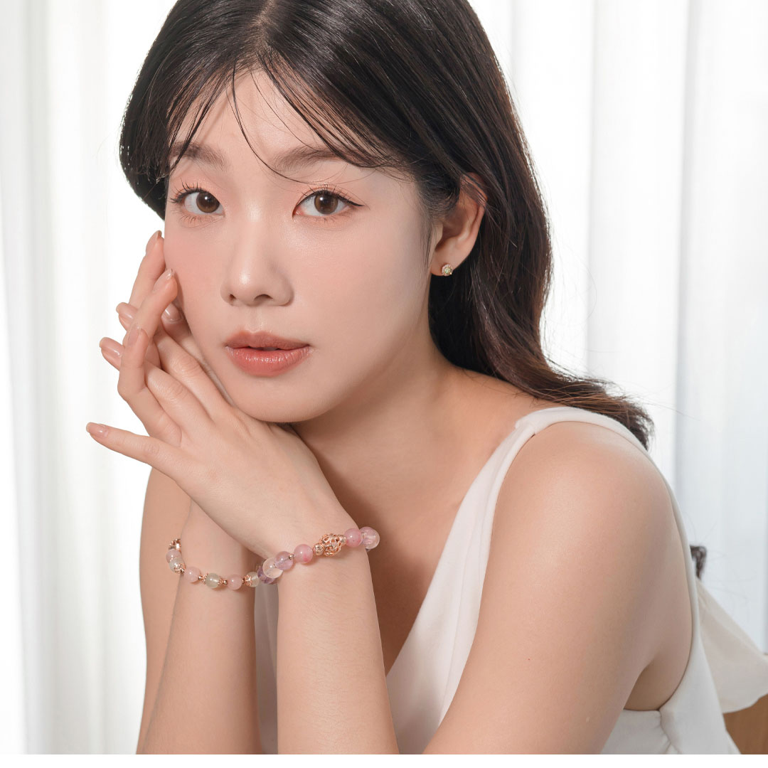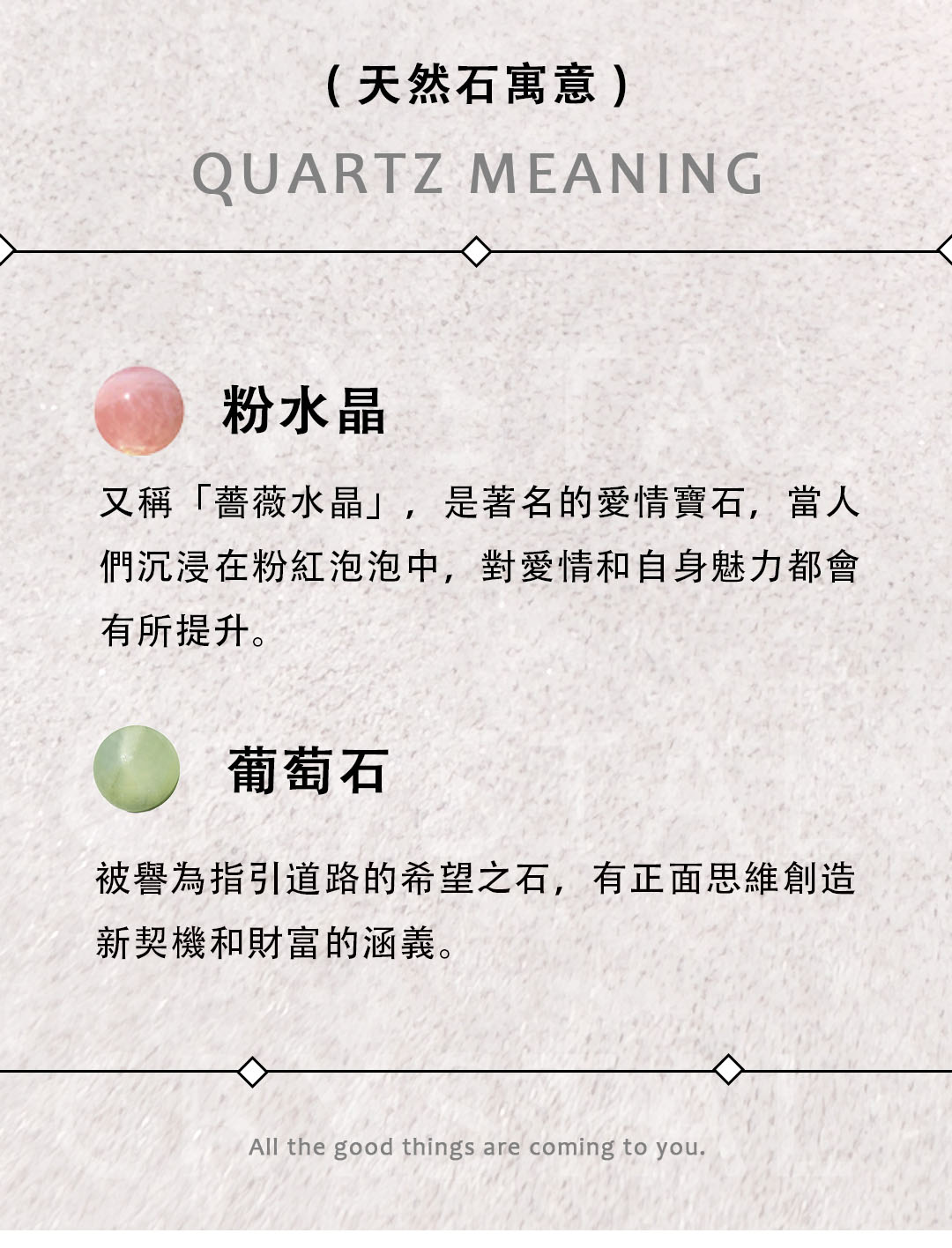 粉水晶 ( Rose Quartz ) 又稱「薔薇水晶」,是著名的愛情寶石, 當人們沉浸在粉紅泡泡中,對愛情和自身魅力都會有所提升。