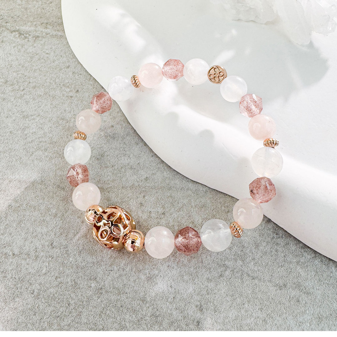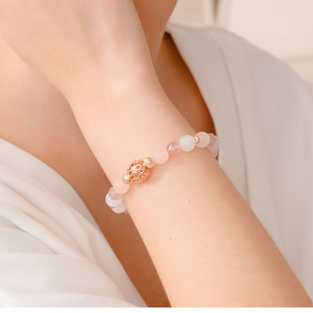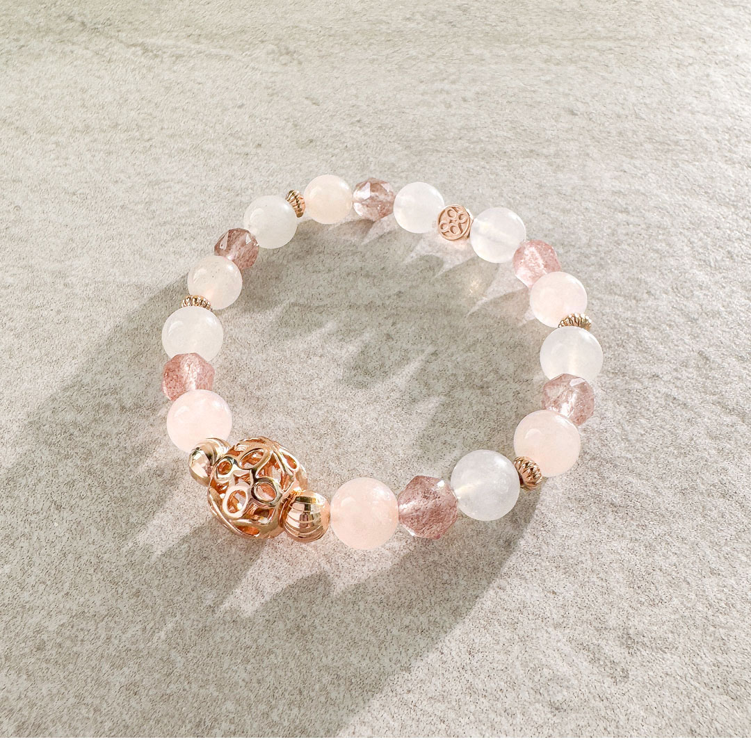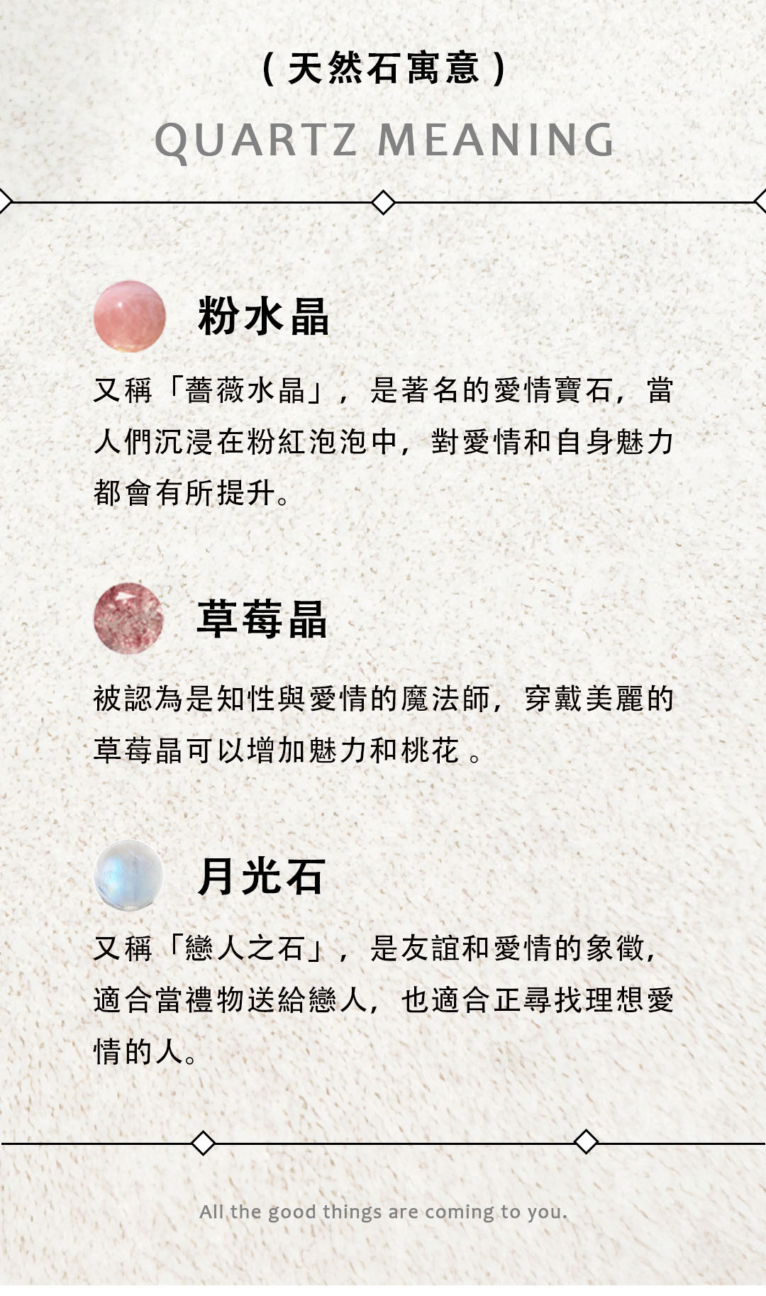 粉水晶 ( Rose Quartz ) 又稱「薔薇水晶」,是著名的愛情寶石, 當人們沉浸在粉紅泡泡中,對愛情和自身魅力都會有所提升。