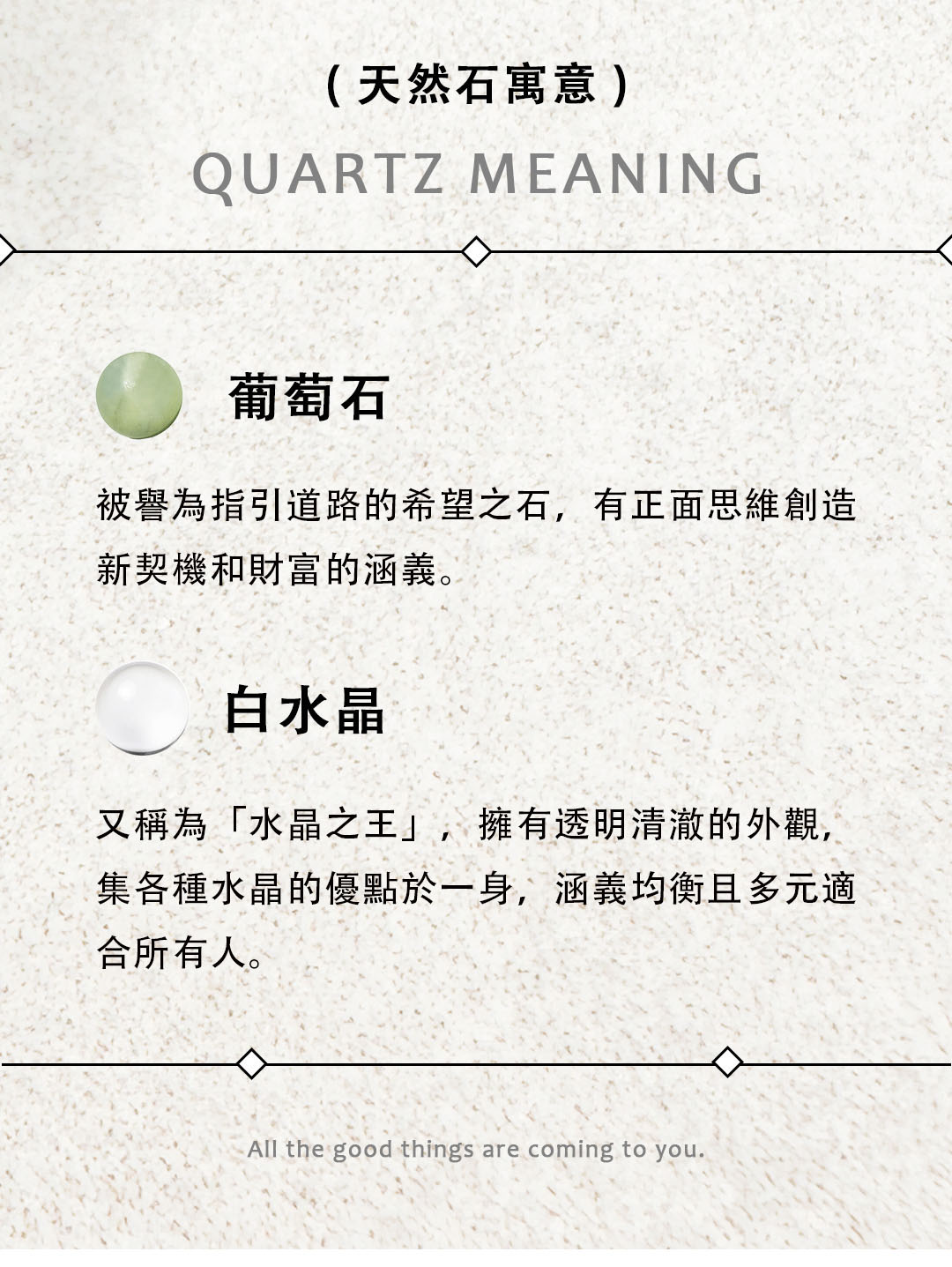 葡萄石 ( Prehnite ) 被譽為指引道路的希望之石,有正面思維創造新契機和財富的涵義。
