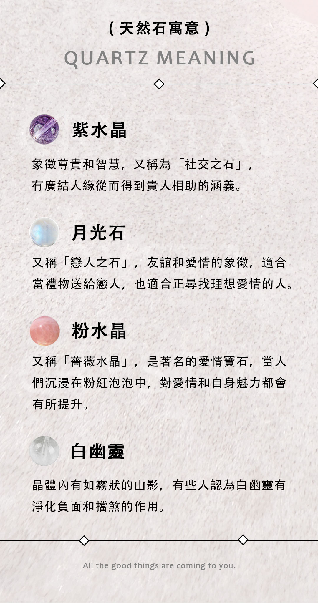 粉水晶 ( Rose Quartz ) 又稱「薔薇水晶」,是著名的愛情寶石, 當人們沉浸在粉紅泡泡中,對愛情和自身魅力都會有所提升。