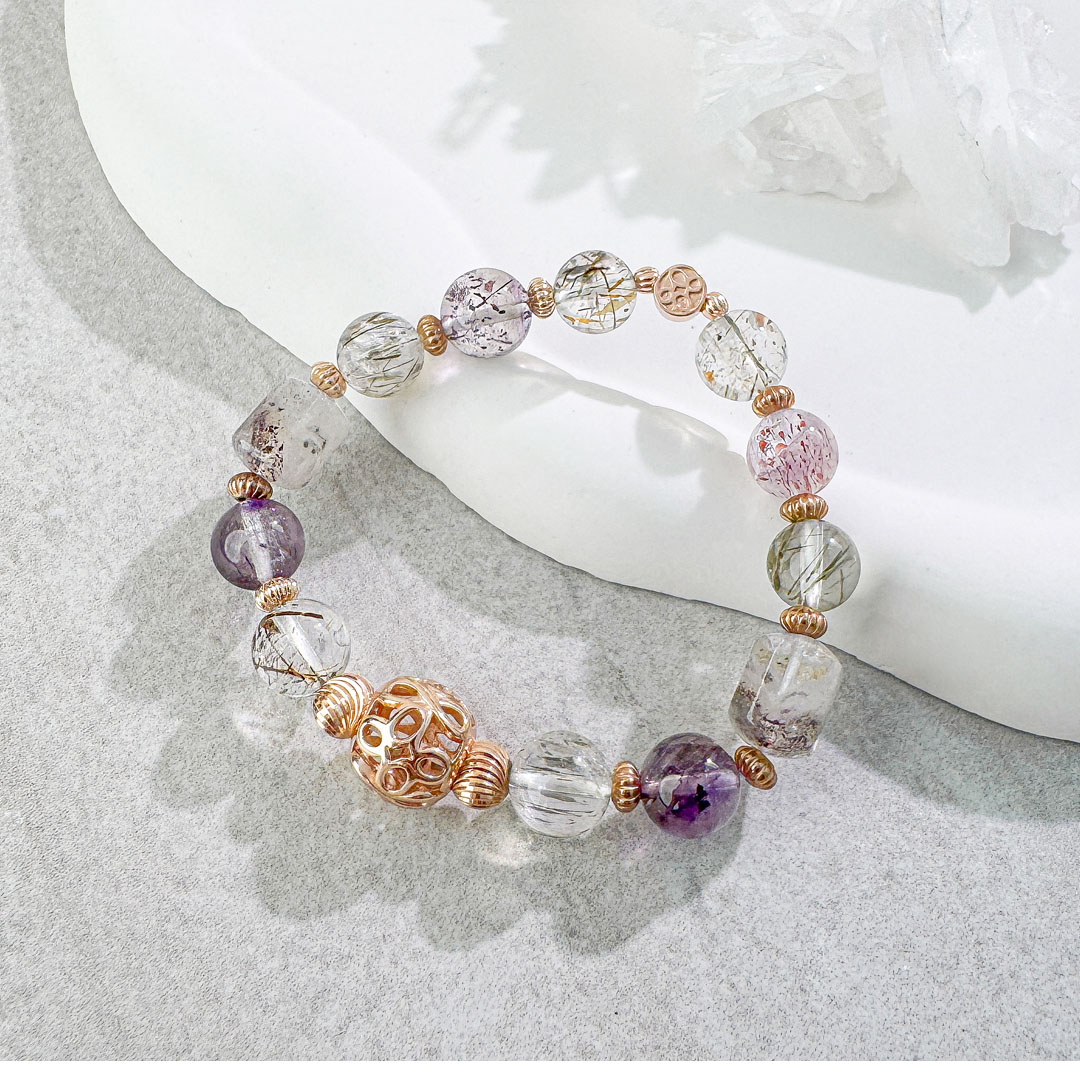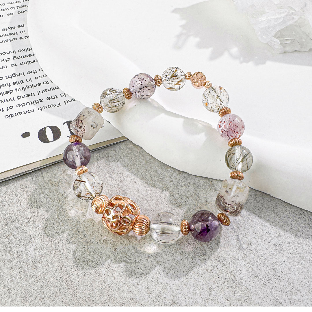 超級七 ( Super Seven ) 內含紫水晶、茶晶、鈦晶、黃磷鐵礦、針鐵礦、纖維礦、金紅石七種礦,集各種水晶的優點於一身。