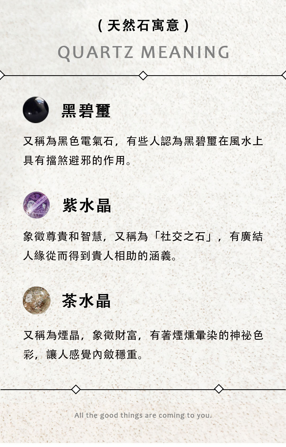 茶水晶 ( Smoky Quartz ) 又稱為煙晶,象徵財富,有著煙燻暈染的神祕色彩,讓人感覺內斂穩重。