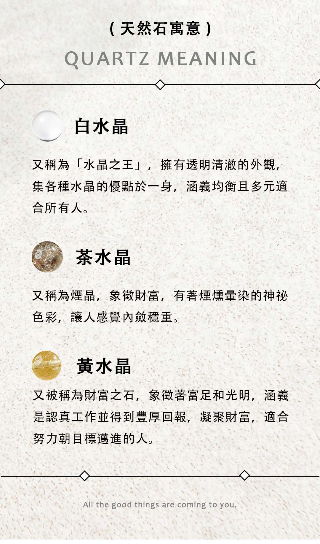 ▴ 天然礦石是在地殼中自然形成的晶體礦物,每一顆的色澤深淺、結晶、髮根都不大相同,且晶體會有冰裂棉絮、坑窪、黑點、礦缺等「天然特質」,並非瑕疵。