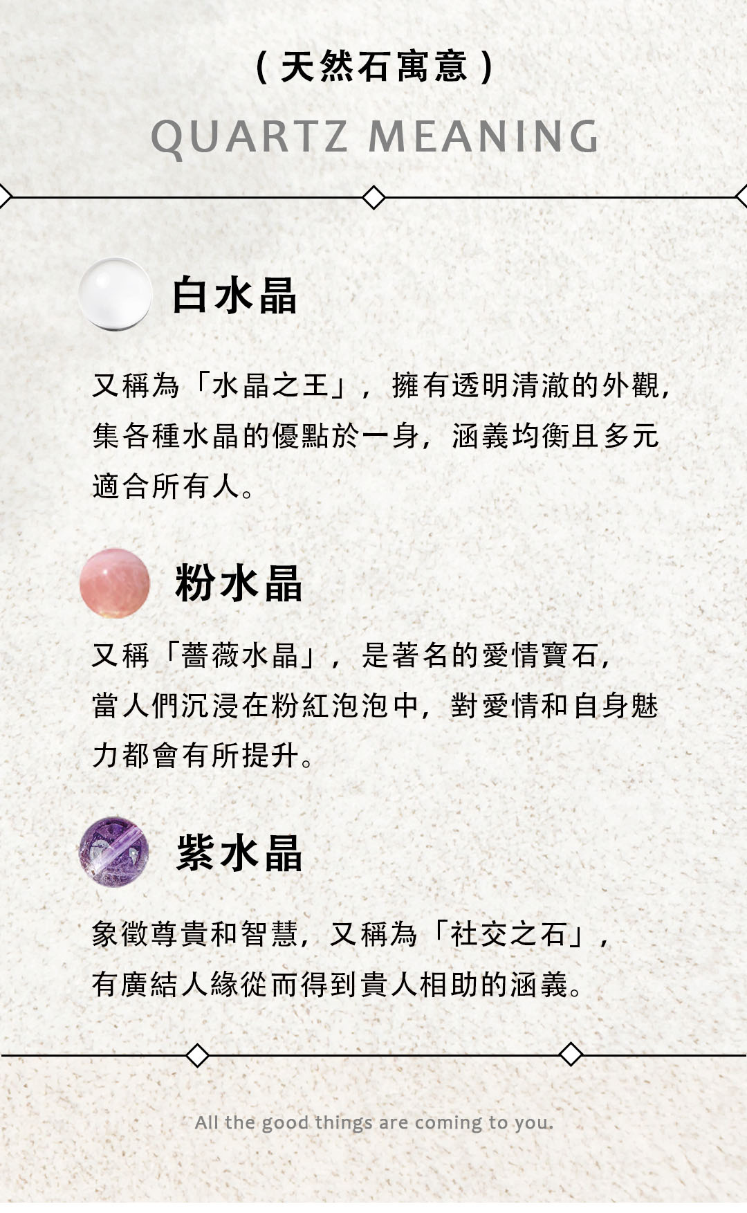 ▴ 天然礦石是在地殼中自然形成的晶體礦物,每一顆的色澤深淺、結晶、髮根都不大相同,且晶體會有冰裂棉絮、坑窪、黑點、礦缺等「天然特質」,並非瑕疵。