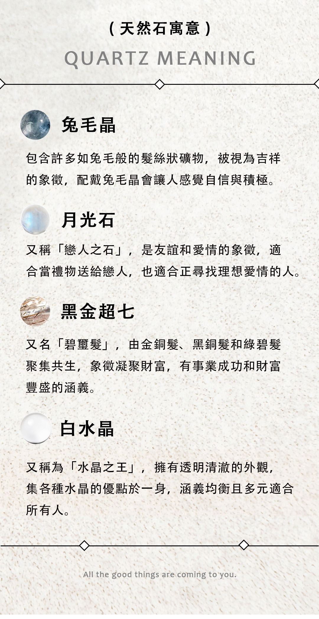 ▴ 天然礦石是在地殼中自然形成的晶體礦物,每一顆的色澤深淺、結晶、髮根都不大相同,且晶體會有冰裂棉絮、坑窪、黑點、礦缺等「天然特質」,並非瑕疵。