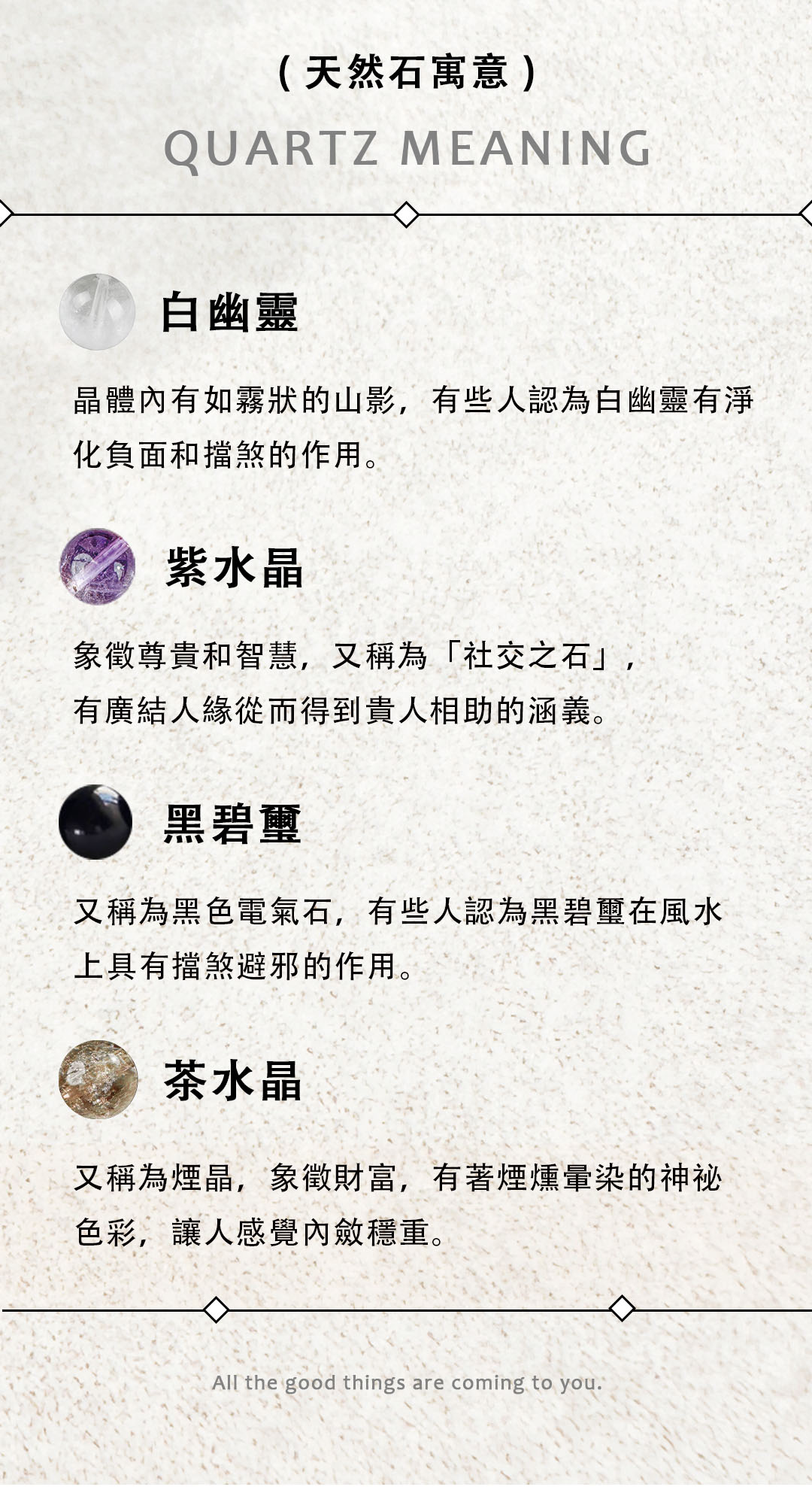 ▴ 天然礦石是在地殼中自然形成的晶體礦物,每一顆的色澤深淺、結晶、髮根都不大相同,且晶體會有冰裂棉絮、坑窪、黑點、礦缺等「天然特質」,並非瑕疵。