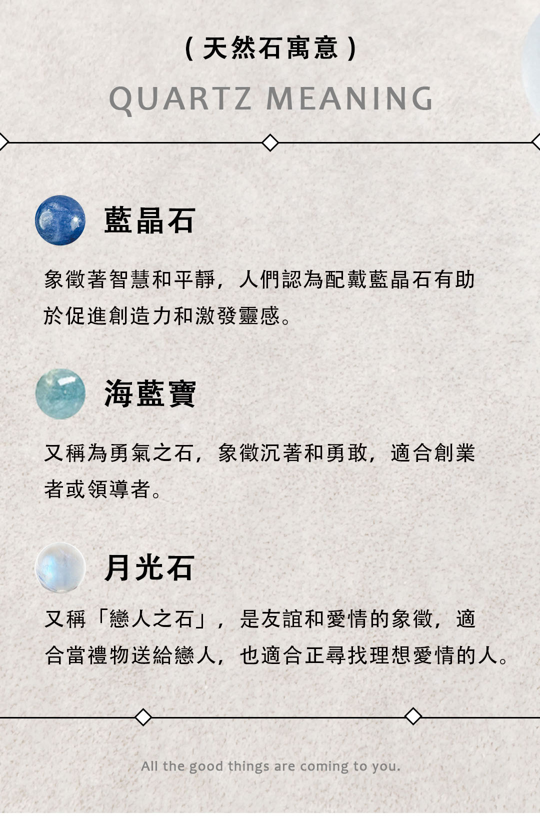 ▴ 天然礦石是在地殼中自然形成的晶體礦物,每一顆的色澤深淺、結晶、髮根都不大相同,且晶體會有冰裂棉絮、坑窪、黑點、礦缺等「天然特質」,並非瑕疵。