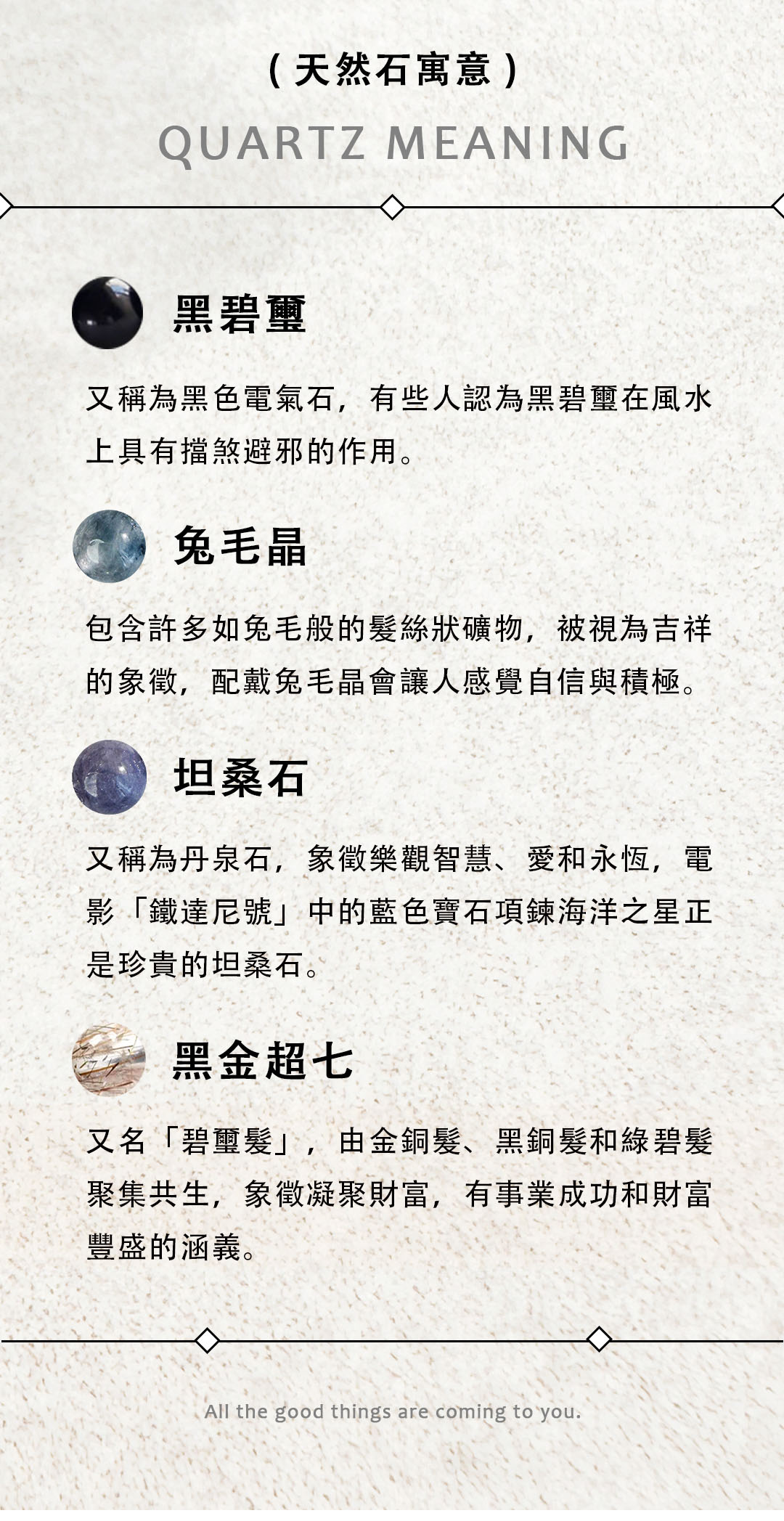 ▴ 天然礦石是在地殼中自然形成的晶體礦物,每一顆的色澤深淺、結晶、髮根都不大相同,且晶體會有冰裂棉絮、坑窪、黑點、礦缺等「天然特質」,並非瑕疵。