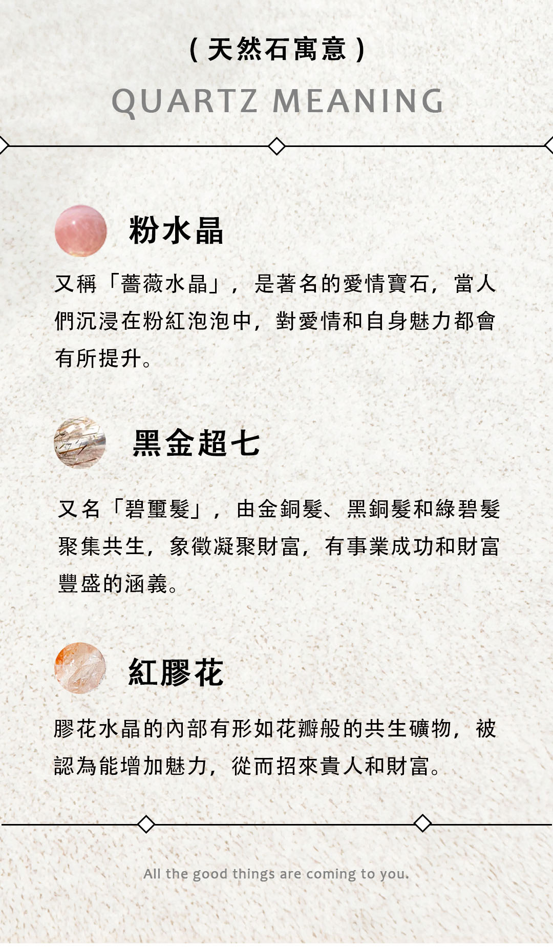 ▴ 天然礦石是在地殼中自然形成的晶體礦物,每一顆的色澤深淺、結晶、髮根都不大相同,且晶體會有冰裂棉絮、坑窪、黑點、礦缺等「天然特質」,並非瑕疵。