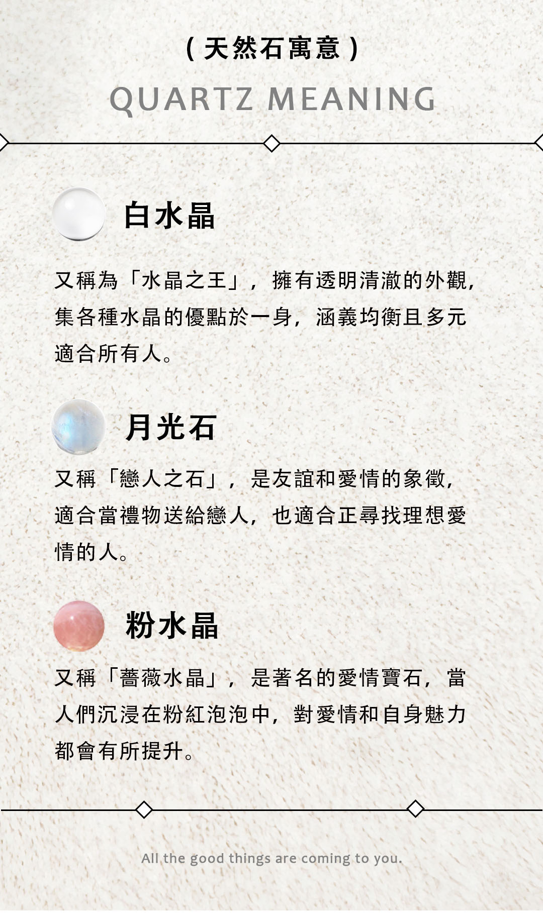 粉水晶 ( Rose Quartz ) 又稱「薔薇水晶」,是著名的愛情寶石, 當人們沉浸在粉紅泡泡中,對愛情和自身魅力都會有所提升。