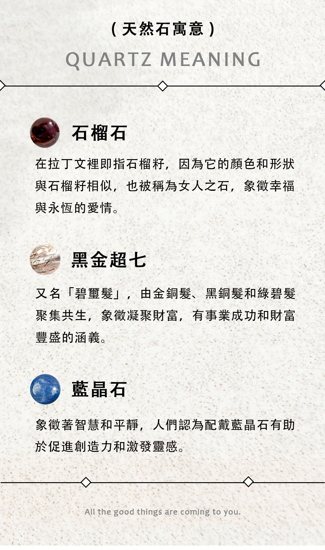 ▴ 天然礦石是在地殼中自然形成的晶體礦物,每一顆的色澤深淺、結晶、髮根都不大相同,且晶體會有冰裂棉絮、坑窪、黑點、礦缺等「天然特質」,並非瑕疵。