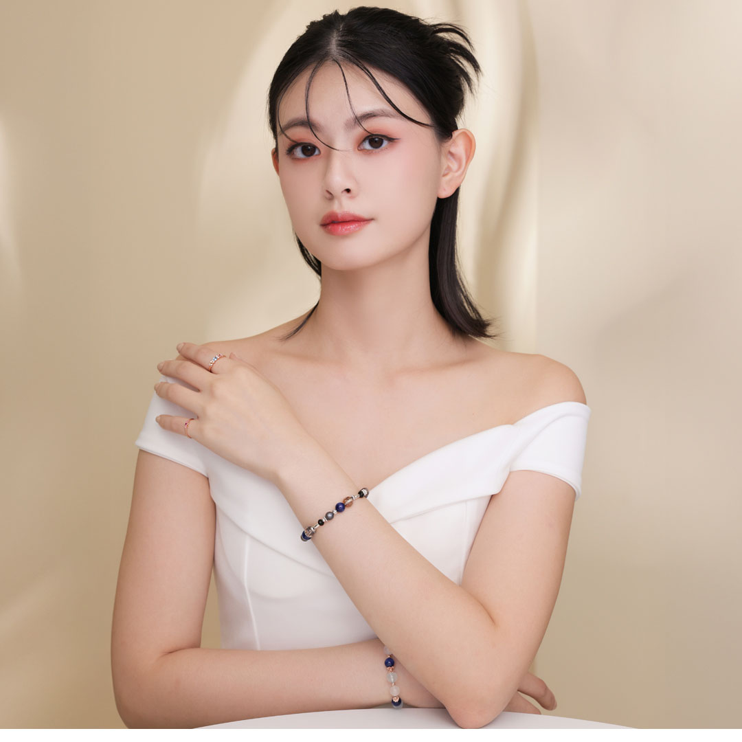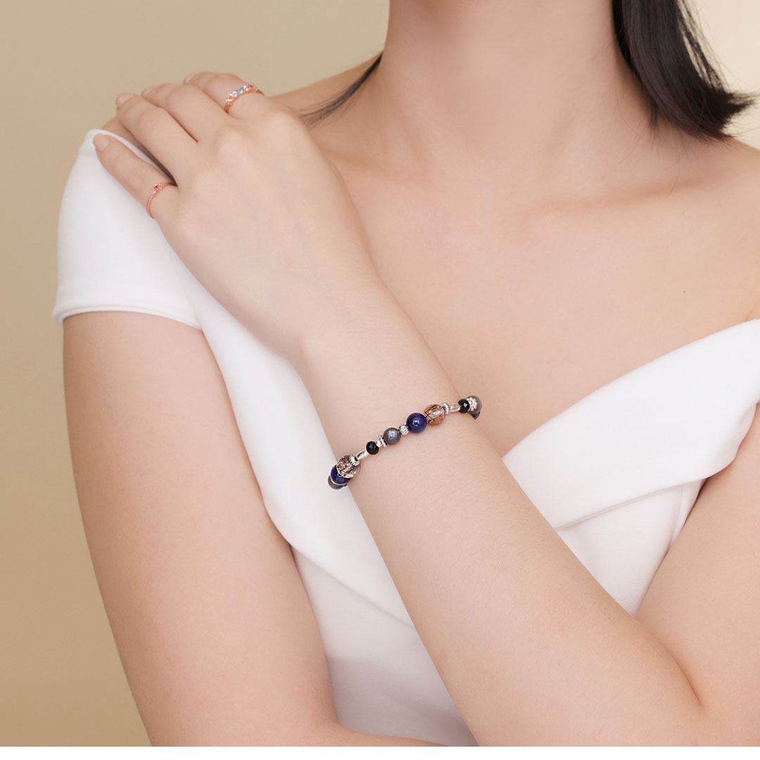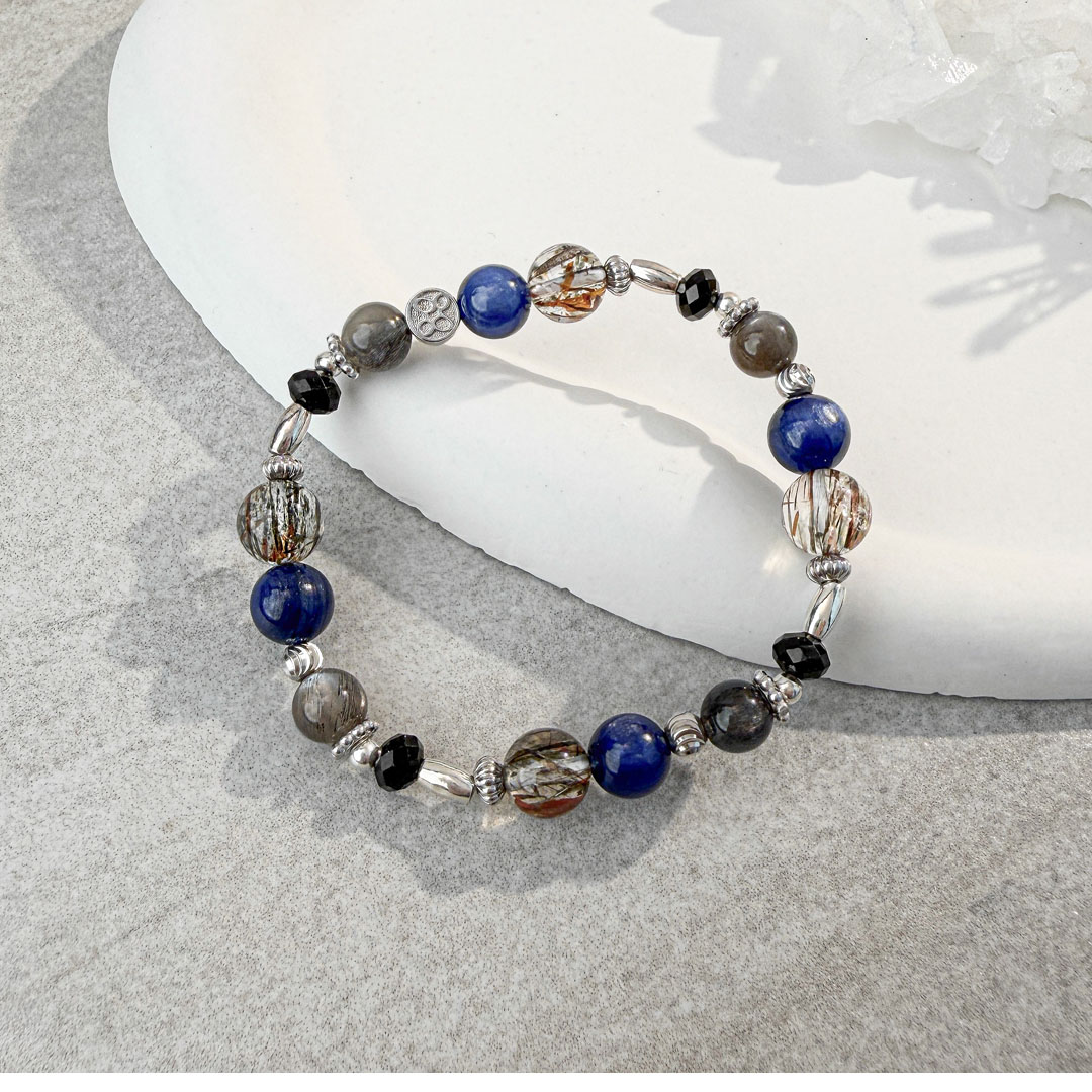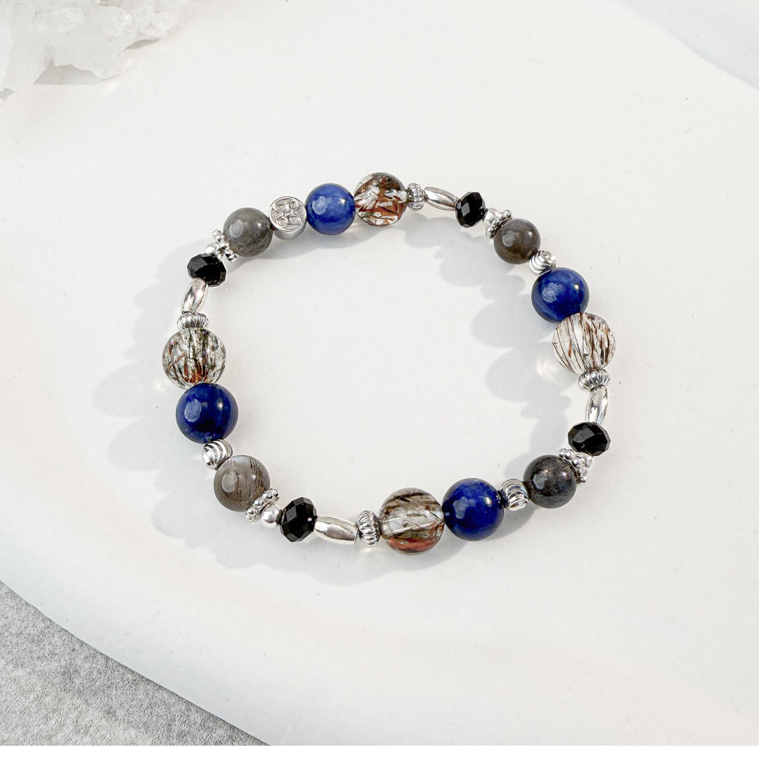 黑骨幹水晶 (Black Sun stone) 深色的層次像沉澱後留下的軌跡,如同暗處綻放的微光, 象徵沉著、自信與重新聚焦的意象。