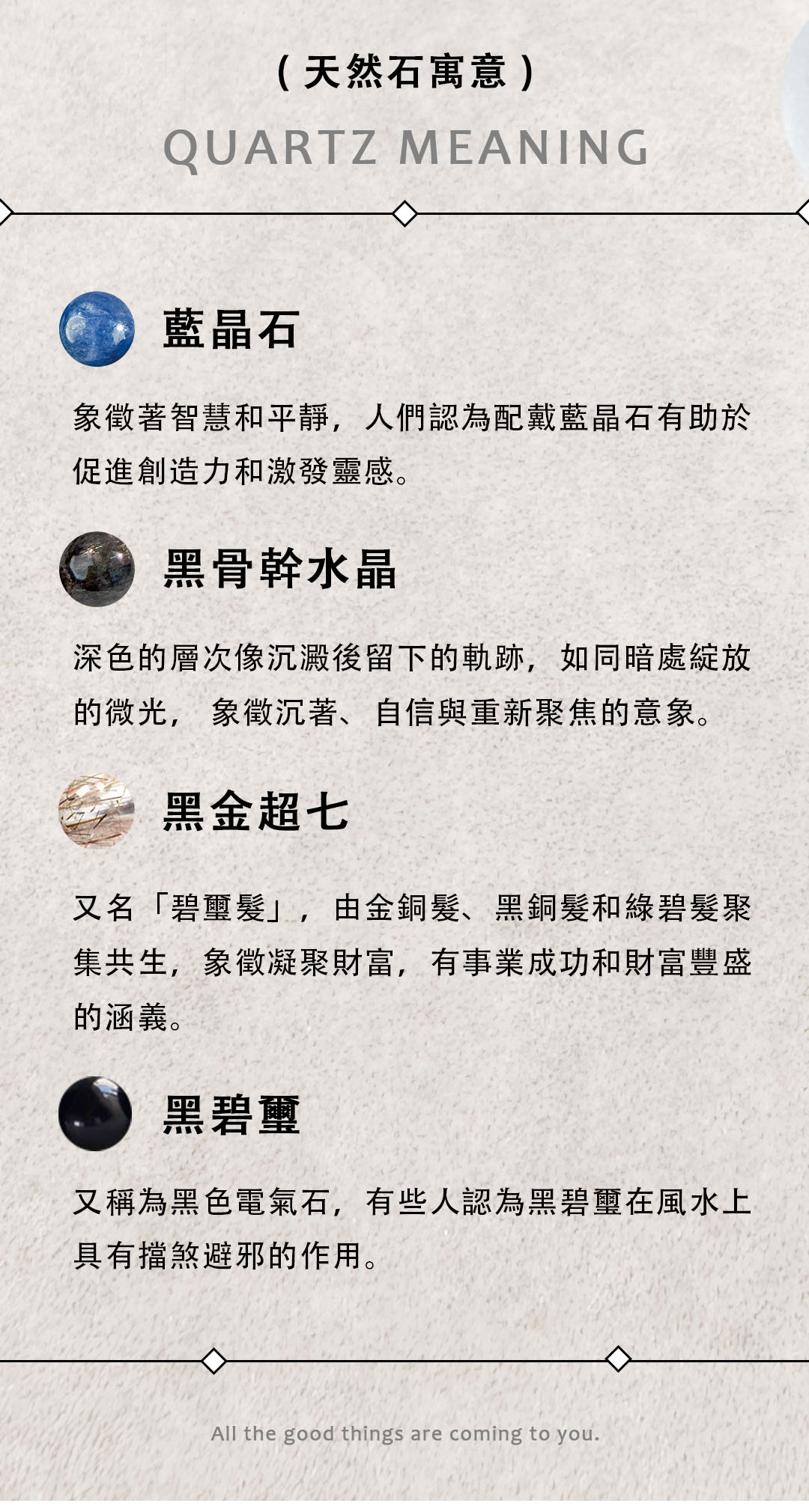▴ 天然礦石是在地殼中自然形成的晶體礦物,每一顆的色澤深淺、結晶、髮根都不大相同,且晶體會有冰裂棉絮、坑窪、黑點、礦缺等「天然特質」,並非瑕疵。