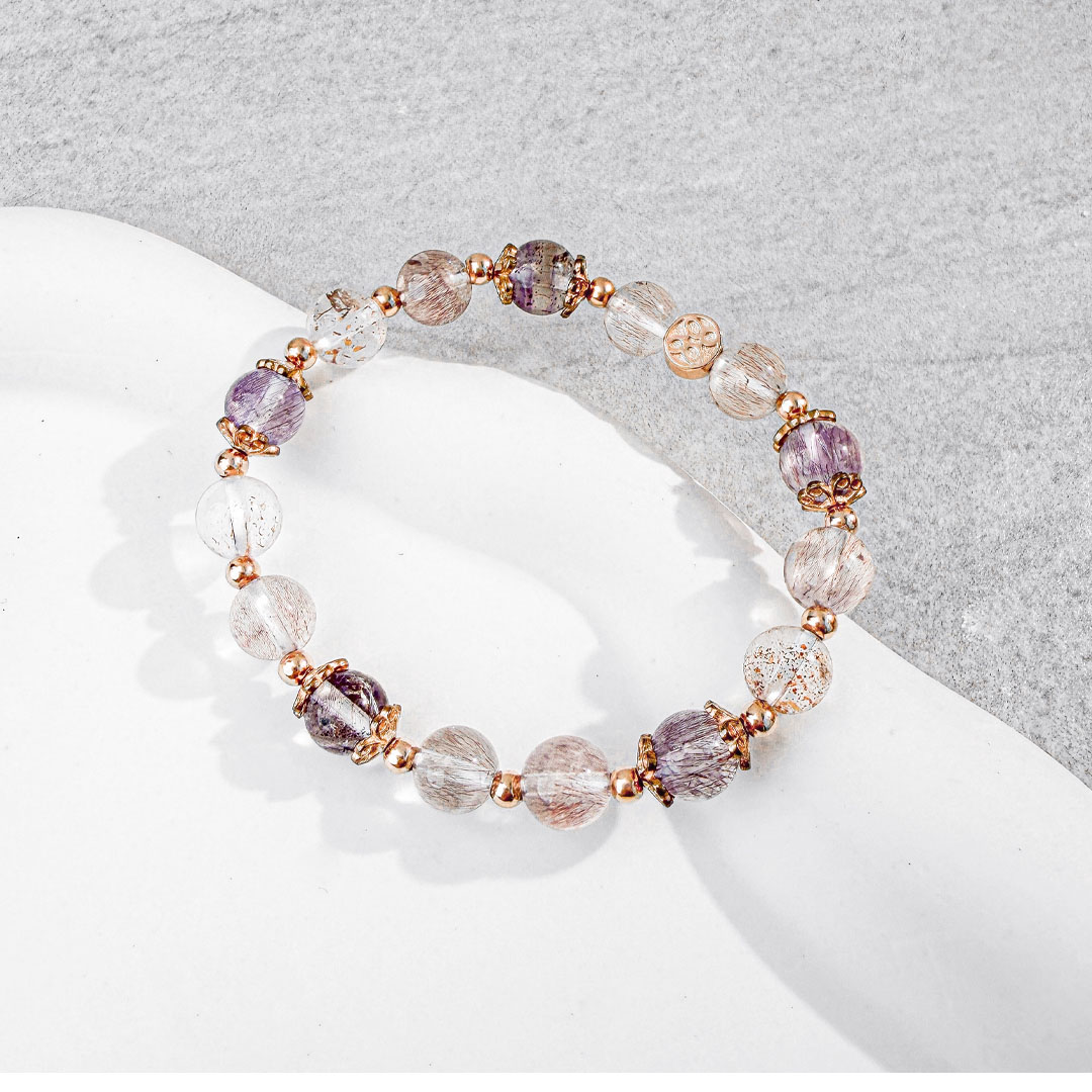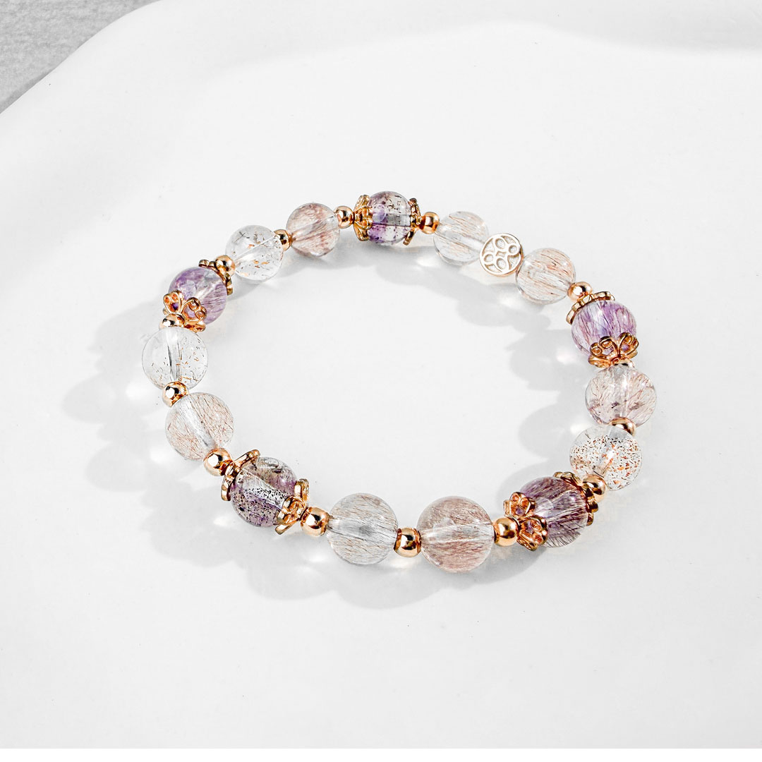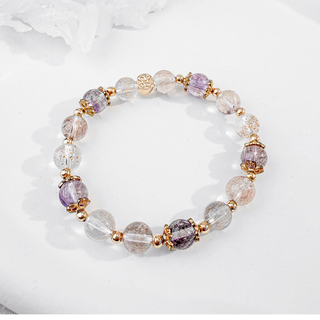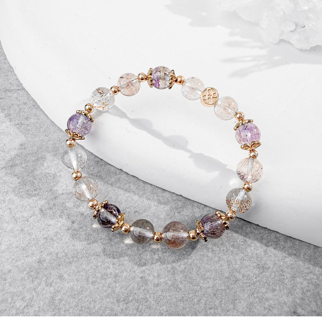 超級七 ( Super Seven ) 內含紫水晶、茶晶、鈦晶、黃磷鐵礦、針鐵礦、纖維礦、金紅石七種礦,集各種水晶的優點於一身。