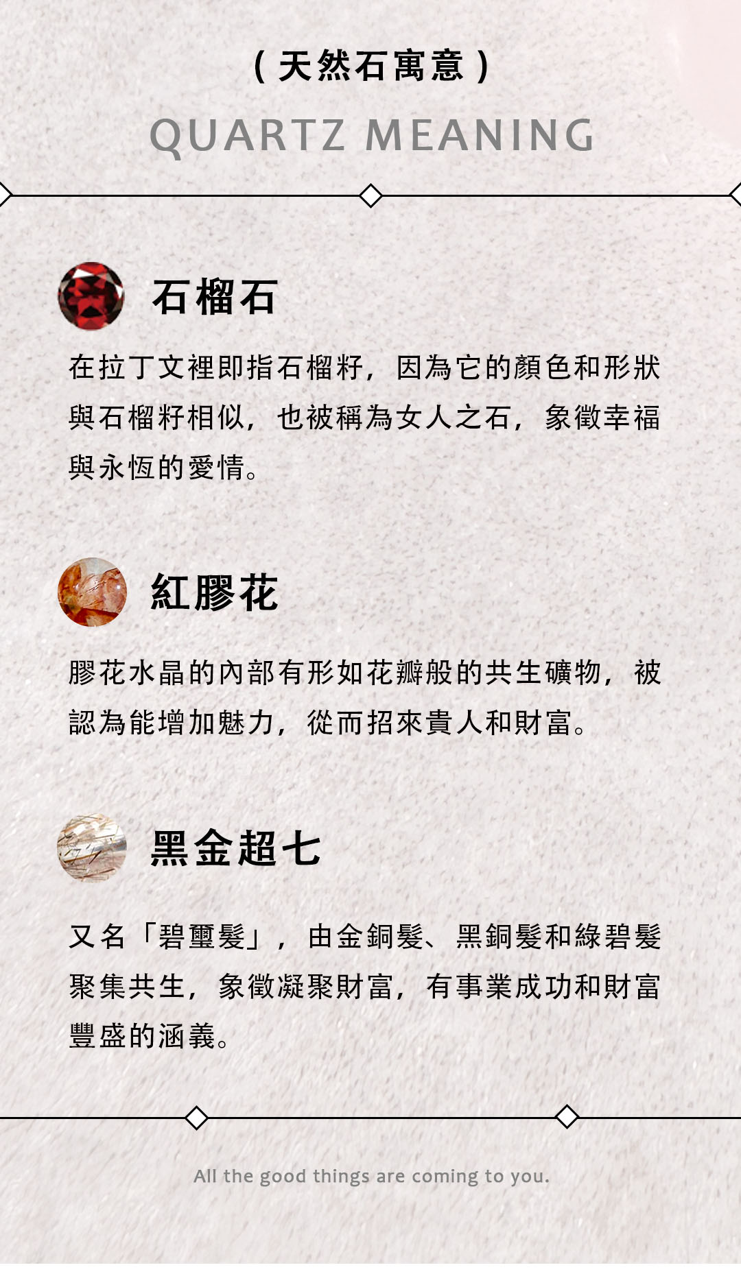 ▴ 天然礦石是在地殼中自然形成的晶體礦物,每一顆的色澤深淺、結晶、髮根都不大相同,且晶體會有冰裂棉絮、坑窪、黑點、礦缺等「天然特質」,並非瑕疵。